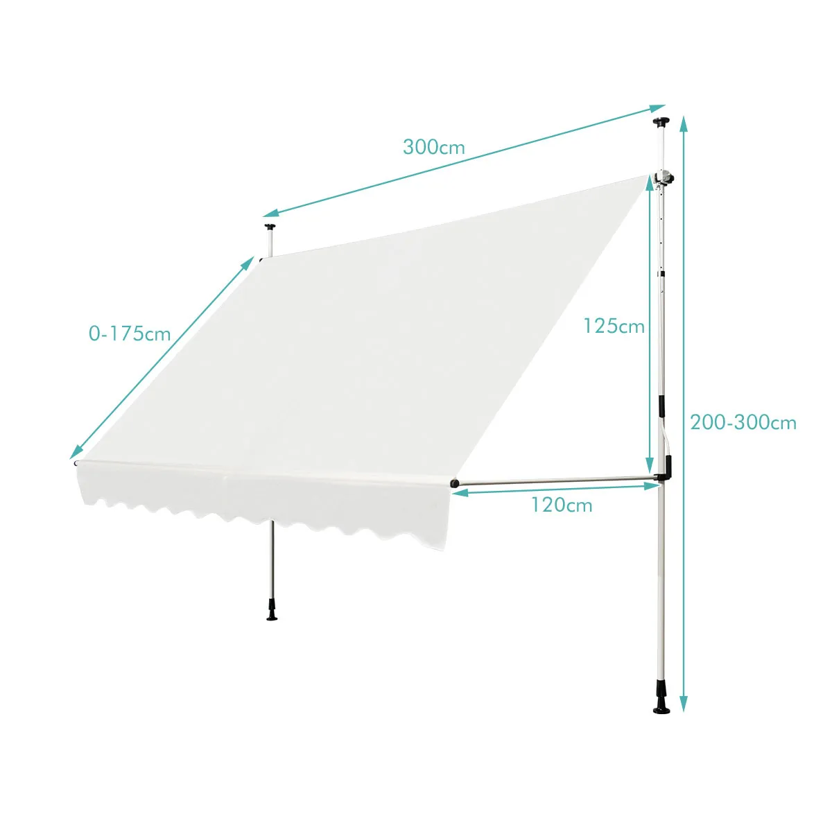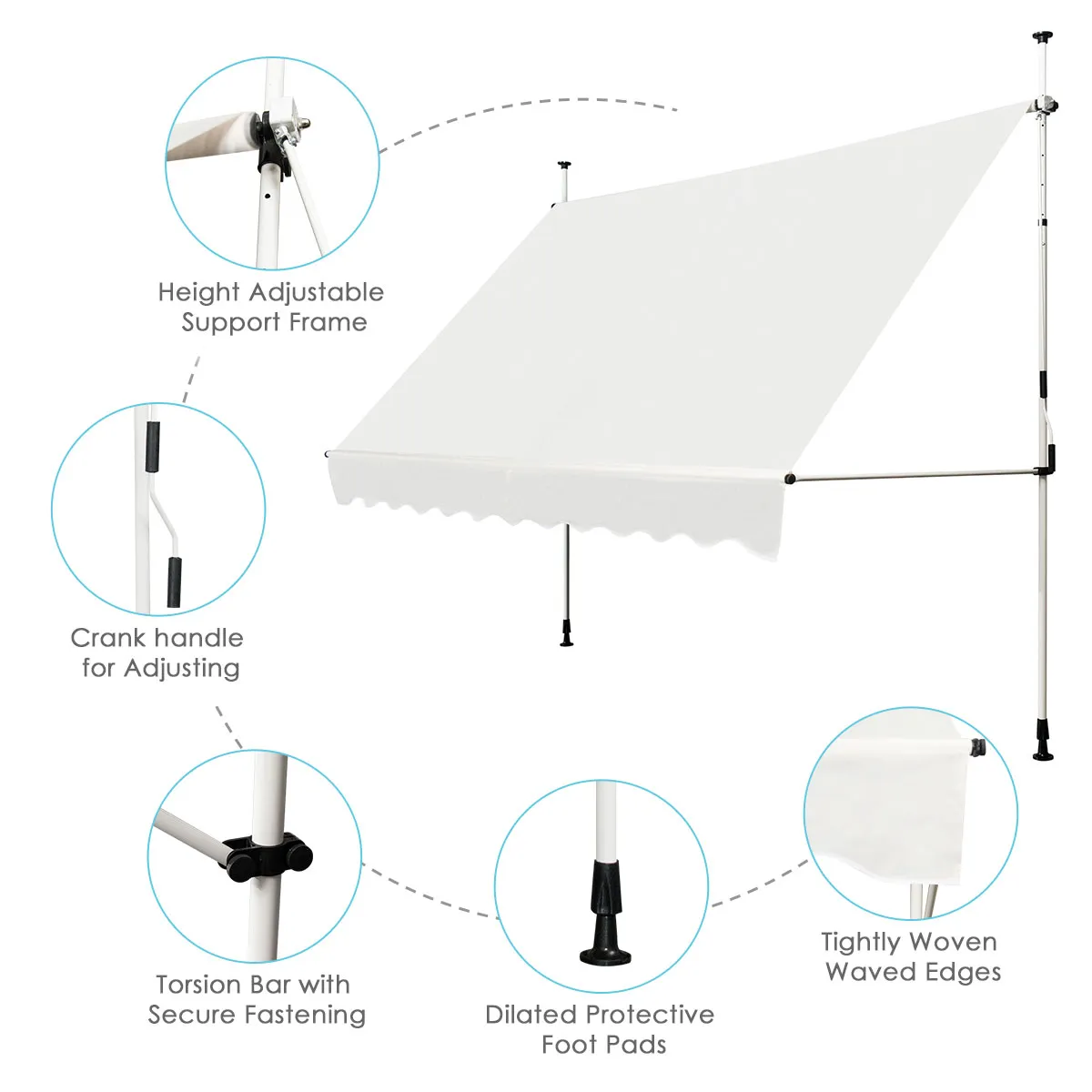 【Verstelbare buis & Handzwengel】De hoogte van de aluminium buis kan worden aangepast van 190cm tot 300cm volgens uw werkelijke behoeften met draaiknop aan de zijkant. Met de handzwengel kan de hoek van de luifel naar wens worden ingesteld. Het maakt niet uit waar de zon staat, het kan de zon goed bedekken.