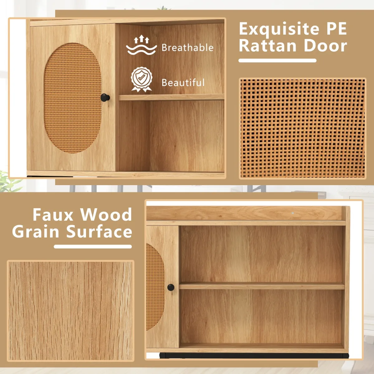 【Praktische en prachtige PE-rotan deur】: De kastdeur van de toiletkast beschermt de erin opgeslagen artikelen tegen stof. De deur beschikt over een prachtige PE-rotan decoratie en een oppervlak met valse houtnerf, die de badkamer een vleugje delicate charme geeft.