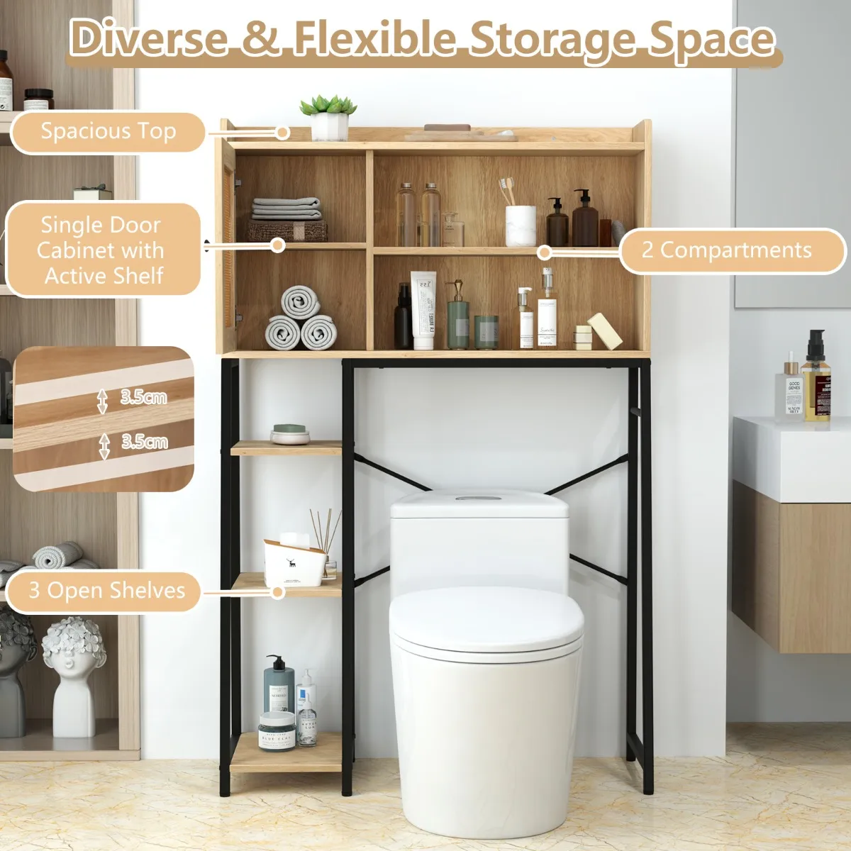 【Veelzijdige en flexibele opbergruimte】: Met 1 bovenste legplank, 1 kast, 2 vakken en 3 open planken biedt het toiletrek voldoende ruimte voor opslag. Bovendien is het verstelbare rek in 3 standen aanpasbaar om verschillende hoogtes van voorwerpen op te bergen.