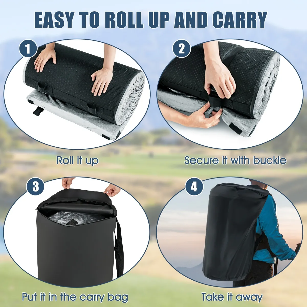 Draagbaar en lichtgewicht ontwerp:Â Wanneer deze campingmatras niet wordt gebruikt, kan hij tot een compact formaat worden opgerold en met riemen en gespen worden vastgezet, waardoor hij gemakkelijk kan worden opgeborgen en veel ruimte wordt bespaard. Daarnaast weegt de mat slechts 3 kg en maakt de draagtas het transport erg handig.