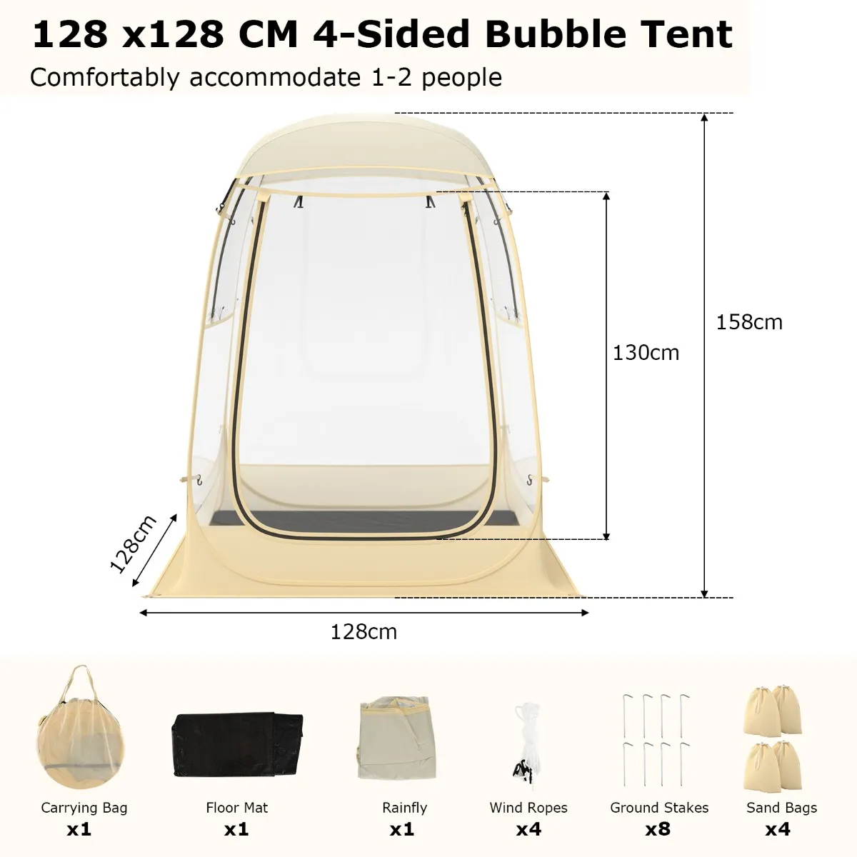 De outdoor luchtkussentent biedt met 128 x 128 x 158 cm (l x b x h) voldoende ruimte voor 1-2 personen. Het transparante pvc-materiaal zorgt voor een royaal 540° panoramazicht, ideaal voor sportevenementen of kamperen. De pop-up structuur maakt een snelle montage mogelijk en wordt geleverd met een compacte draagtas. De weerbestendige tent met vloermat, bovententafdekking en glasvezelmasten beschermt tegen de elementen. Metalen haringen, scheerlijnen en zandzakken beveiligen de tent in verschillende omgevingen. De dubbellaagse mesh-ramen zorgen voor goede ventilatie en een aangename outdoor-ervaring.