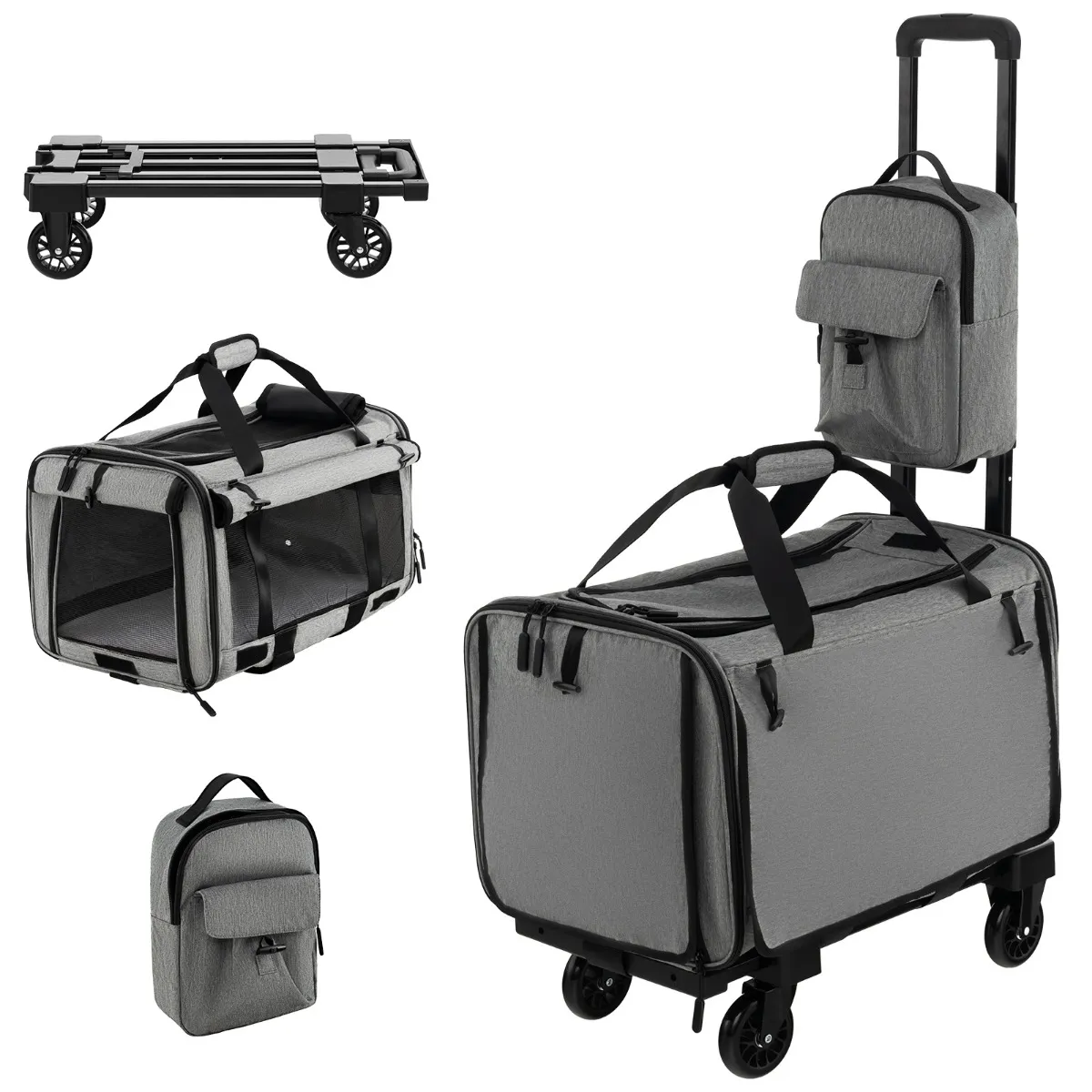 Veel opbergruimte: Met meerdere zijzakken en een bekerhouder kun je je snacks, waterflessen of andere reisbenodigdheden op hun plaats bewaren. Bovendien beschikt de transportbox voor dieren op wielen over een extra huisdiertas, die individueel gebruik mogelijk maakt, of je kunt hem voor het opbergen van huisdierbenodigdheden aan de trolley bevestigen.