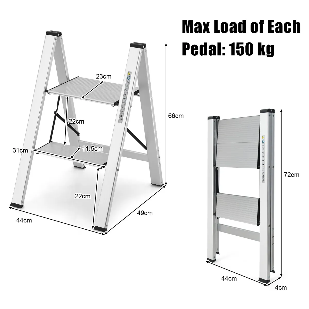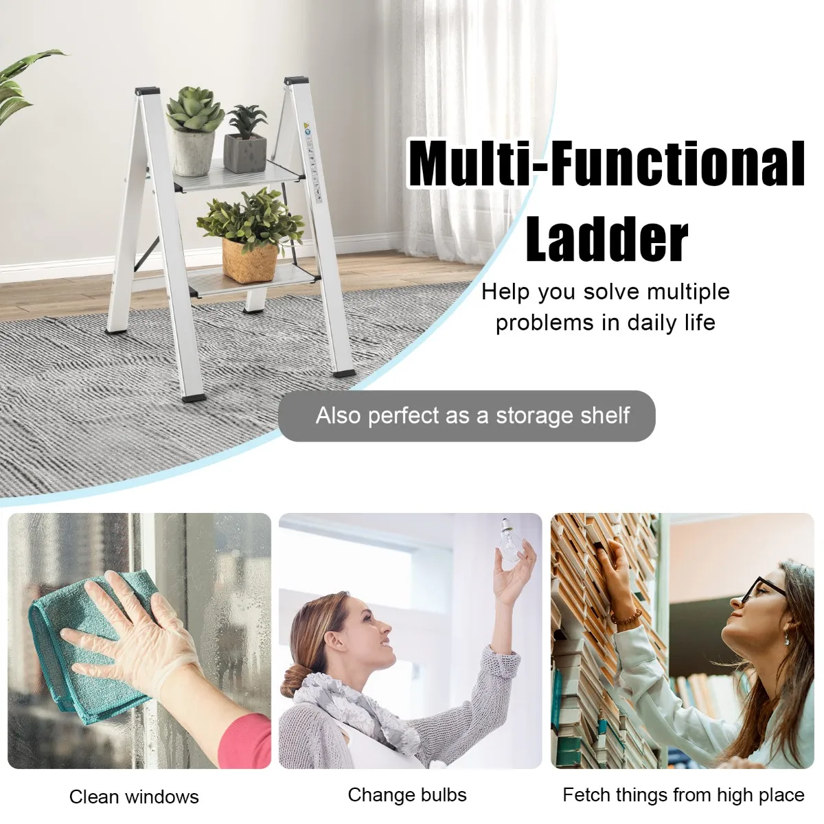 Dankzij het robuuste aluminium frame is deze ladder niet alleen zeer stabiel en veilig te gebruiken, maar kan vanwege het lage gewicht ook gemakkelijk worden vervoerd. De antislip treden en voetkussens zorgen bovendien voor hogere stabiliteit en veiligheid. Na gebruik kun je ze ruimtebesparend eenvoudig achter de deur of onder het bed opbergen. Met zijn draagbare design en hoge functionaliteit is deze trapladder een perfecte hulp in verschillende aspecten van je leven. Met hun hulp is het vervangen van gloeilampen, het bereiken van hogere plaatsen of het poetsen van ramen geen probleem meer. Je kunt ze ook als klein tentoonstellingsrek voor je verzamelingen of planten gebruiken.