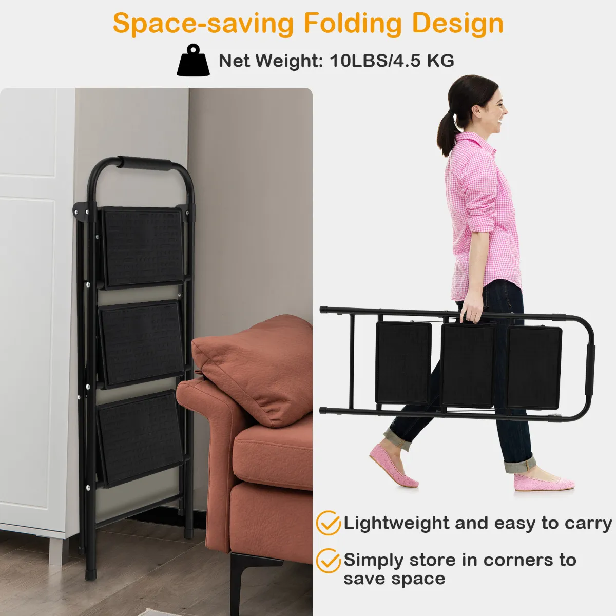 Robuuste metalen structuur : Deze 3-traps ladder bestaat uit een versterkt metalen frame, dat super solide en vervormingsbestendig is. En het gepoedercoate oppervlak beschermt het hele frame tegen roest. Bovendien zorgt de constructie met het veiligheidsslot voor een hogere veiligheid. Elke trede kan tot 265 kg worden belast.