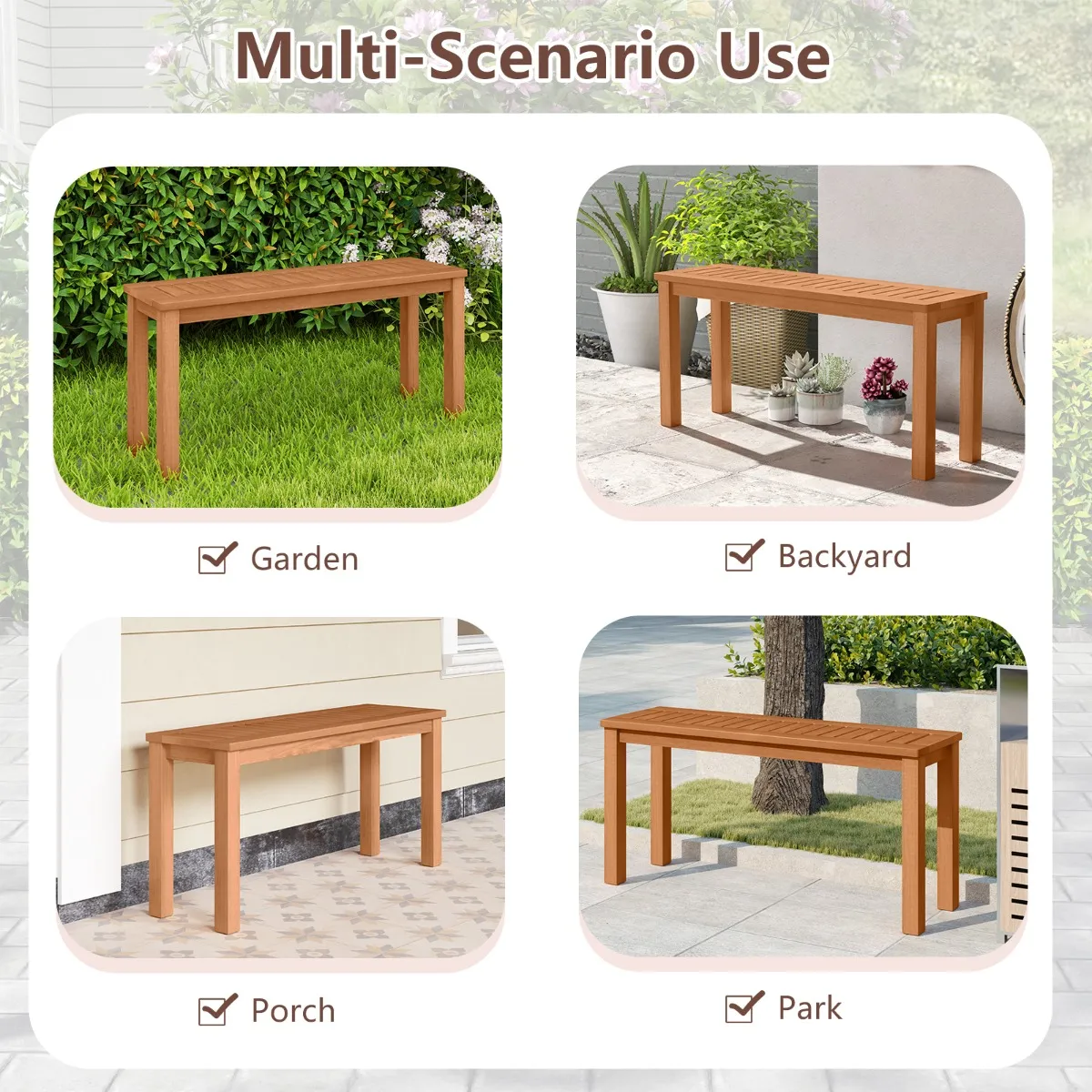 【Veelzijdig gebruik】: De teakolie-afgewerkte houten bank is zo ontworpen dat hij in elke buiten- of binnenruimte past. Gebruik hem als comfortabele outdoorbank in je tuin, op de veranda of zelfs als praktische schoenenwisselbank bij de entree.