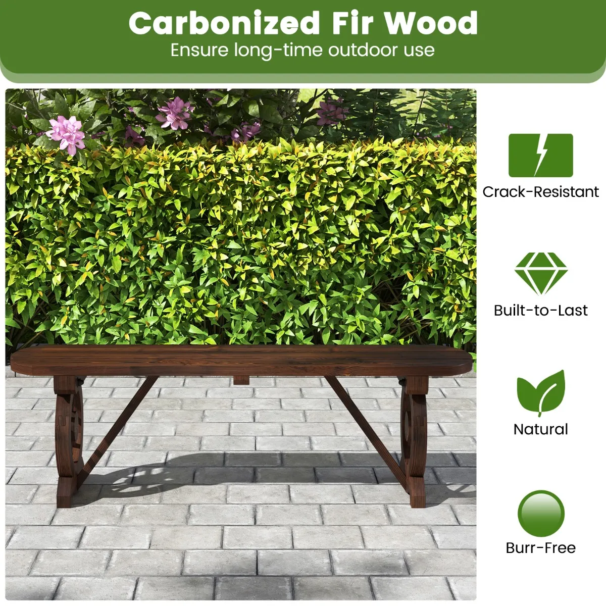 【Gecarboniseerd dennenhout】 De tuinbank bestaat volledig uit hoogwaardig dennenhout met carbonisatiebehandeling, is scheurvast en garandeert een langdurig gebruik buitenshuis. En de extra steunstangen bieden een sterkere grip.