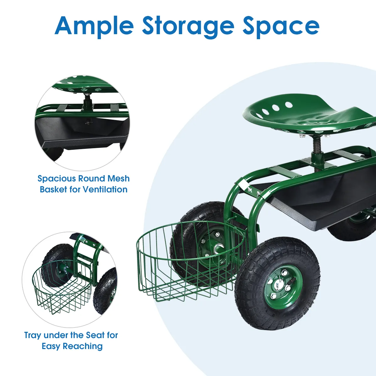 De veelzijdige tuinwagen is zo ontworpen dat hij lang meegaat en uit zwaar metaal en opgeblazen rubberen banden bestaat. De tuinwagen is voorzien van een groene poedercoating en is daardoor een elegante aanvulling voor je tuin. De tuinwagen beschikt over een stuurbare handgreep, waarvan de hoogte kan worden ingesteld, zodat personen van verschillende afmetingen hem gemakkelijk kunnen verplaatsen. Bovendien beschikt de wagen over een ergonomisch vormgegeven zitting voor een aangenamere werkervaring. Bovendien bevindt zich onder de zitting een zwarte plank, en een opbergmand en een plank achter op de wagen bieden voldoende ruimte voor je plantengereedschap, bloempotten enz.