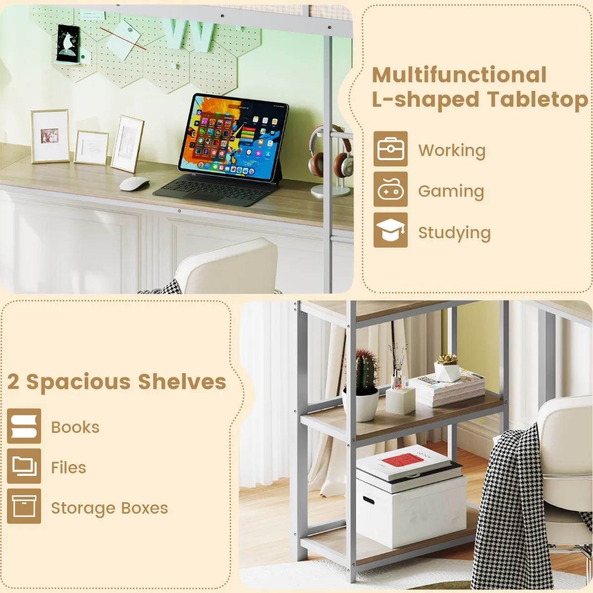 【Maximaliseer de ruimte】: Het verhoogde bed is ontworpen om uw ruimte overzichtelijk en divers te maken. Uitgerust met een L-vormig bureau en 2 ruime opbergplanken is dit de ideale oplossing voor gameliefhebbers, ijverige studenten of mensen die op zoek zijn naar een stijlvol thuiskantoor.