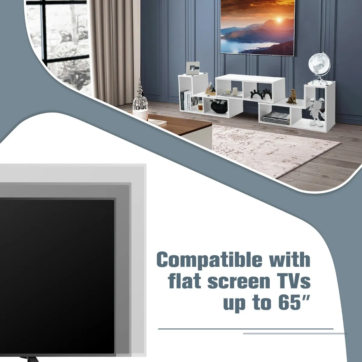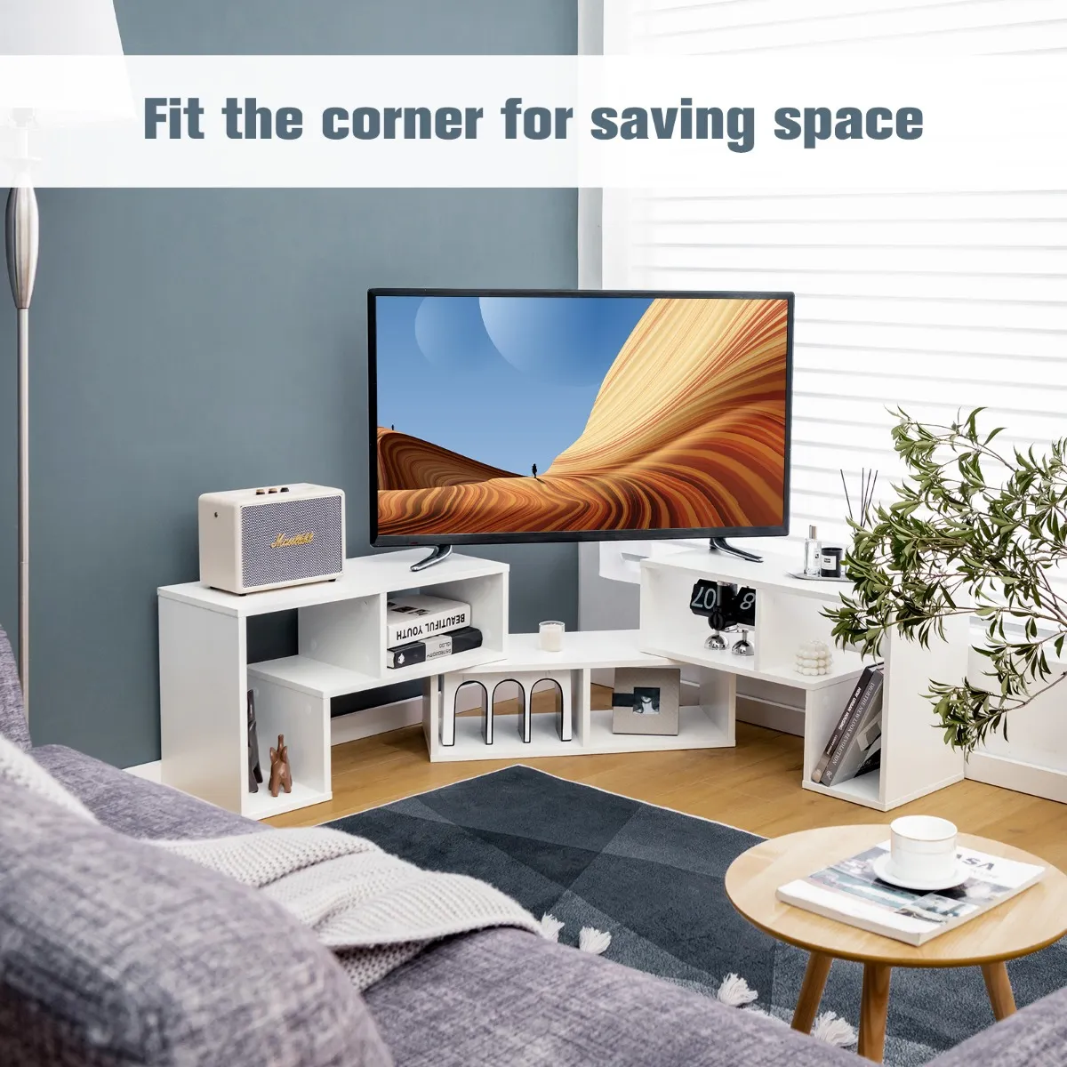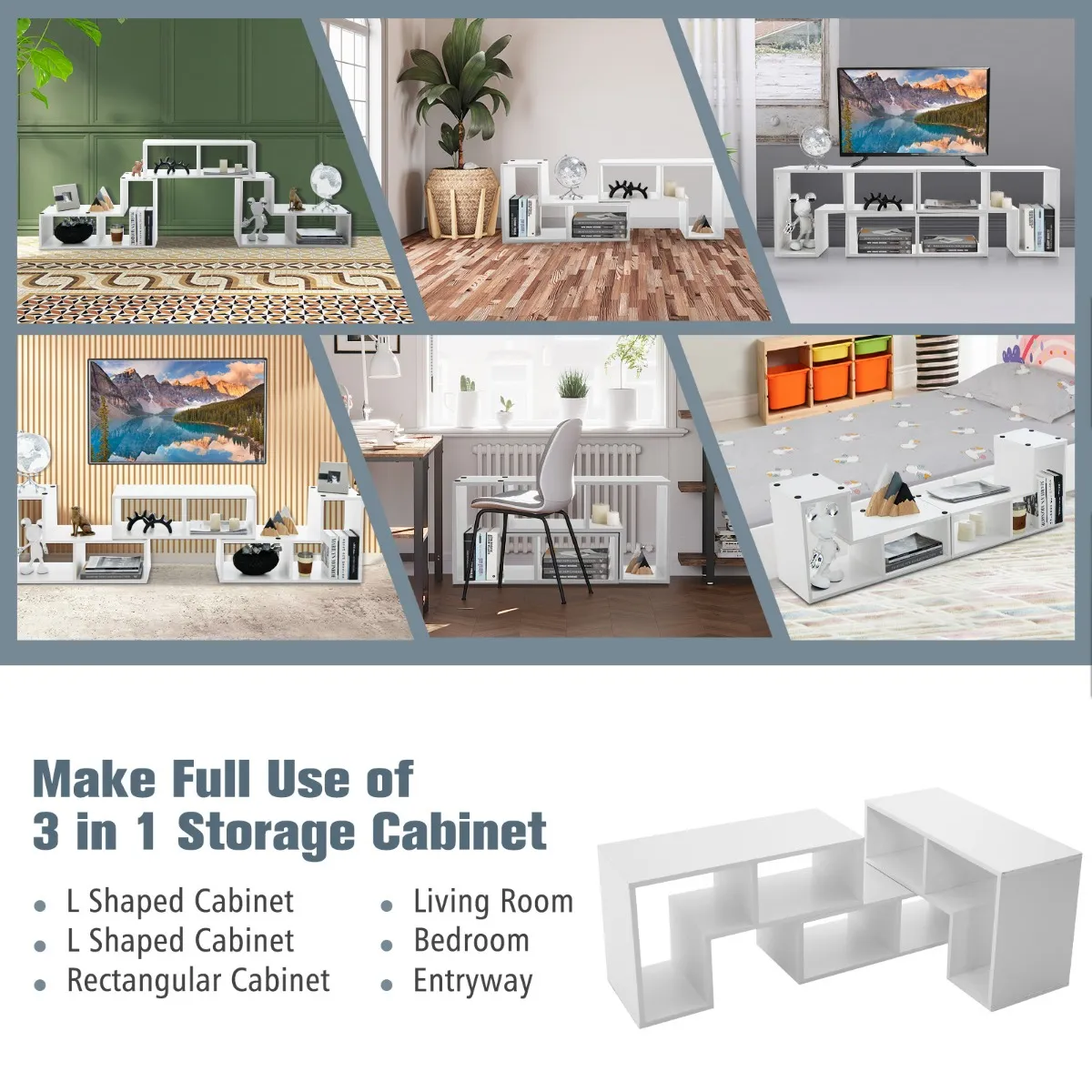 De eenheid beschikt over vrije combinaties, waarvan de meest voorkomende 3 stijlen zijn getoond in de foto’s. Aangezien de 2 L-vormige planken op de rechthoekige worden gestapeld, kunnen zij worden uitgebreid of worden gedraaid om aan verschillende behoeften te voldoen. Daarom kunt u het gebruiken als een lage tv-consoletafel, een hoekopbergkast of een staande displayplank. Bovendien bieden de 6 verschillende vakken een ordelijke oplossing voor het opbergen van verschillende elektronica, boeken en andere ornamenten. Bovendien zijn de goed geconstrueerde planken tamelijk stevig en duurzaam, en er worden antislip doppen meegeleverd voor een versterkte stabiliteit. Het entertainment center heeft overigens een strak en minimalistisch uiterlijk, met de schroefgaten afgedekt met stickers.