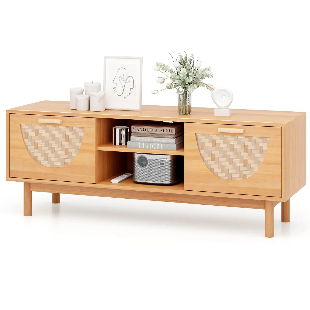 Moderne stijl uit het midden van de eeuw : Dit moderne tv-meubel past moeiteloos in een reeks decorstijlen. De met bamboe geweven textuur van de lades verbetert niet alleen de esthetiek, maar voegt ook een op de natuur geïnspireerde warmte toe aan elke kamer.