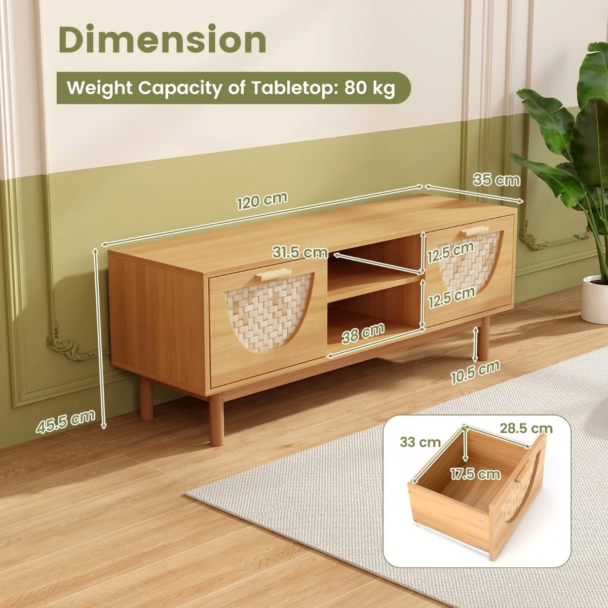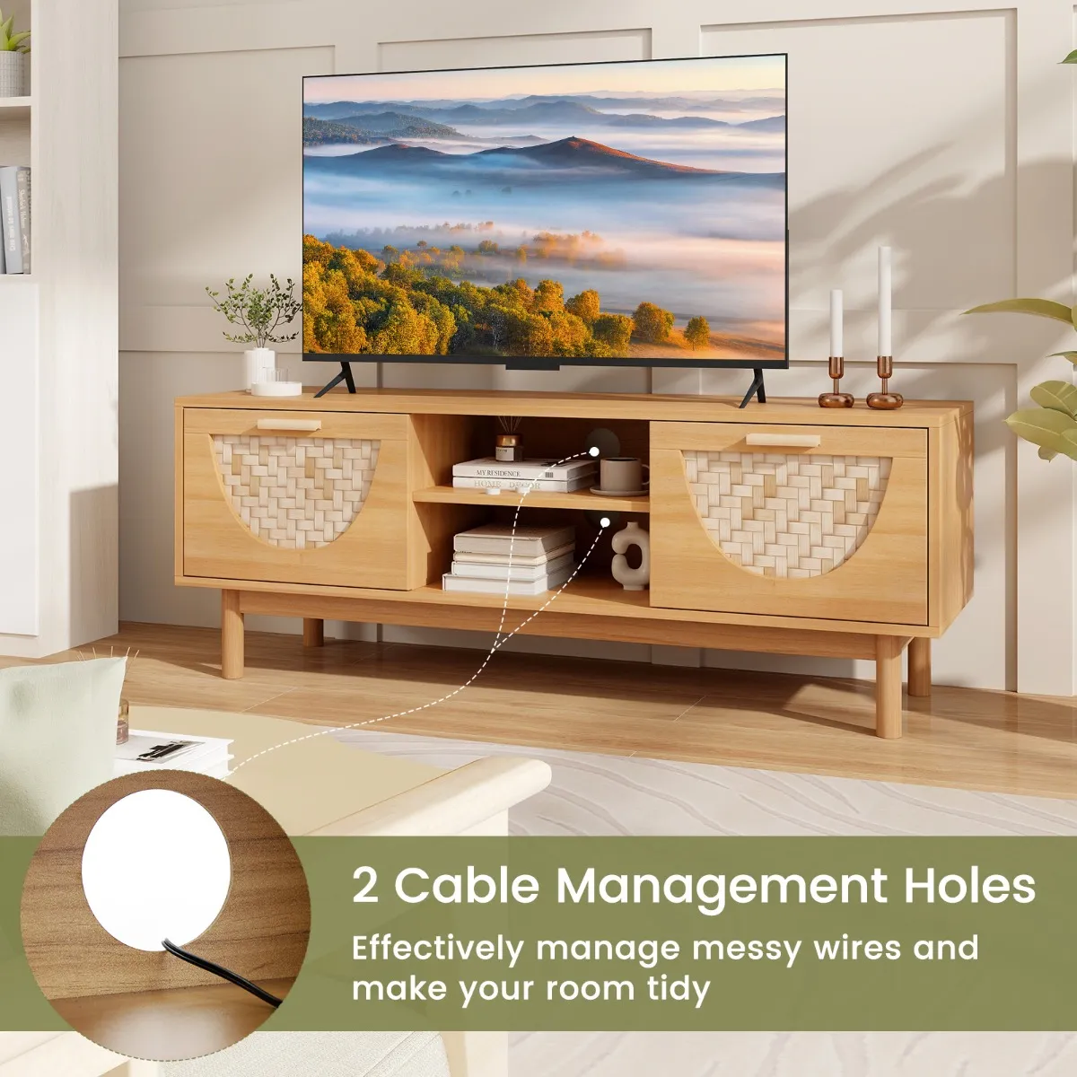 De mediakast biedt een mix van functionaliteit en elegant ontwerp, ontworpen om tv’s tot 55 inch te ondersteunen. Het heeft charmante geweven bamboe lades, die een harmonieuze balans bieden tussen klassiek design en opslagbehoeften. De open schappen bieden gemakkelijke toegang tot elektronische apparaten. Het bevat 2 kabelmanagementgaten voor eenvoudige, georganiseerde installatie.