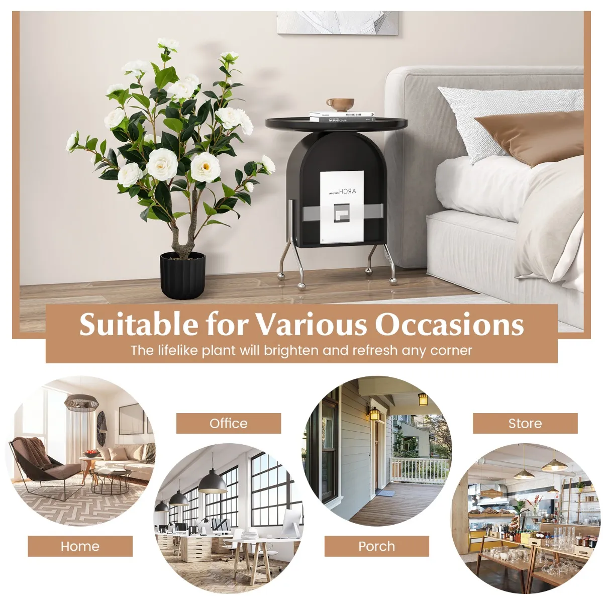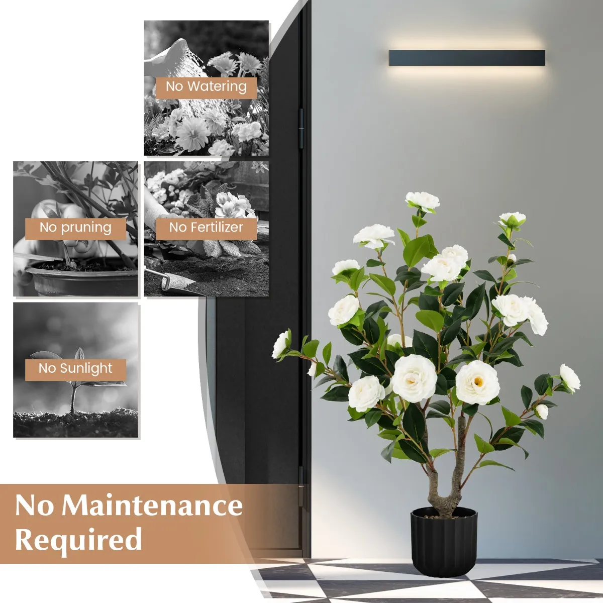 Geen onderhoud nodig: Deze kunstmatige Camellia boom heeft geen onderhoud nodig. Je hoeft hem geen water te geven, te snoeien, in de zon te zetten of te bemesten, dus hij blijft het hele jaar door bloeien en levendig. Als hij stoffig wordt, veeg je hem gewoon af met een vochtige doek of een plumeau.