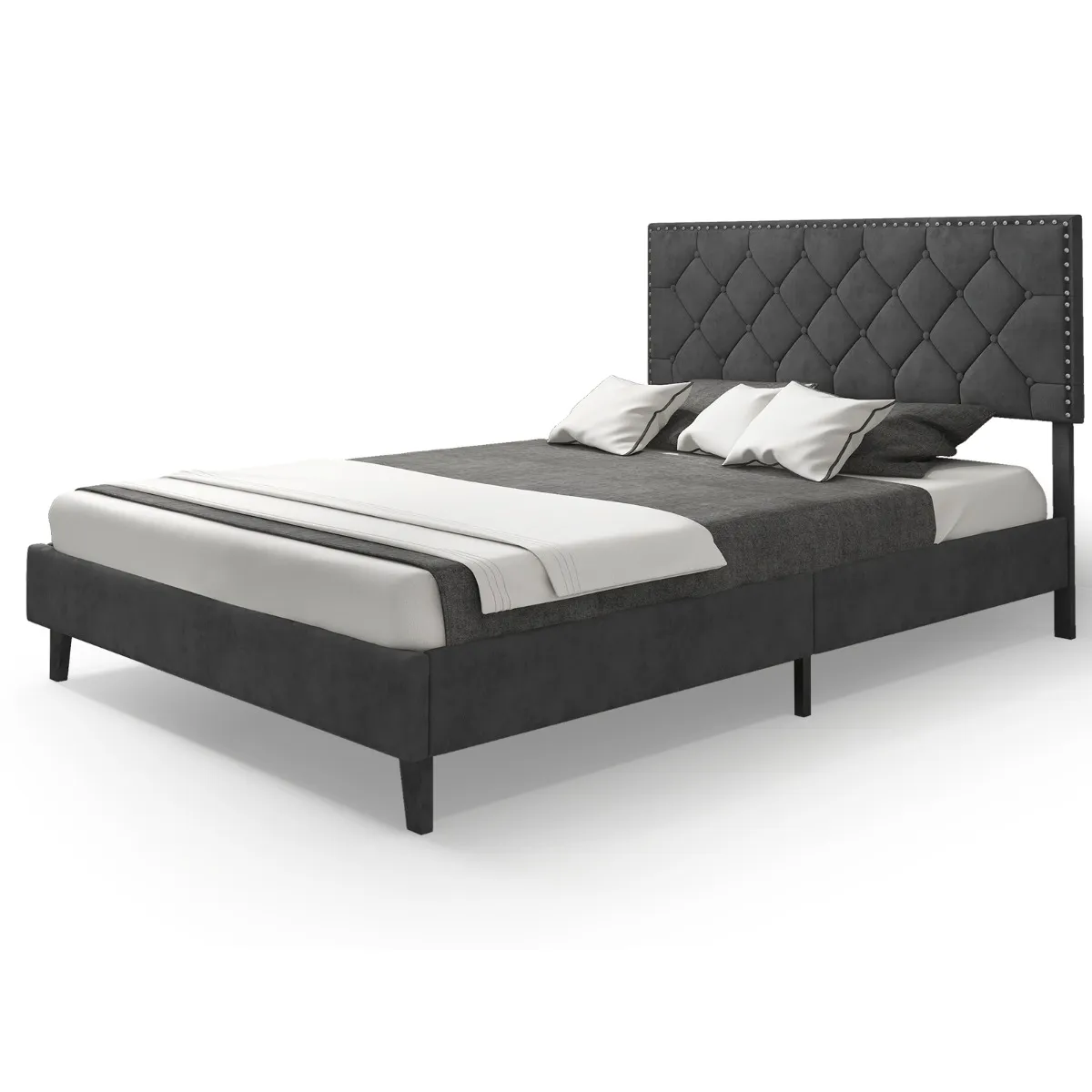 Ons bed voldoet aan uw dagelijkse slaap- en vrijetijdsbehoeften. Ondersteund door massief houten latten is de lattenbodem robuust en duurzaam voor een lange levensduur. De extra middelste steunpoten verbeteren ook de algehele stabiliteit van het bedframe. Dankzij de combinatie van zachte spons en huidvriendelijk fluweel biedt het hoofdbord een comfortabele gebruikservaring om op te leunen. Met knoopdecoratie en modern design heeft de lattenbodem een ​​uitstekende uitstraling en laat hij uw goede smaak zien. Dit bedframe biedt u een comfortabele slaapomgeving van betrouwbare kwaliteit!
