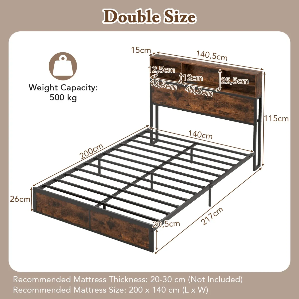 - Aanbevolen matrasdikte: 20-30 cm