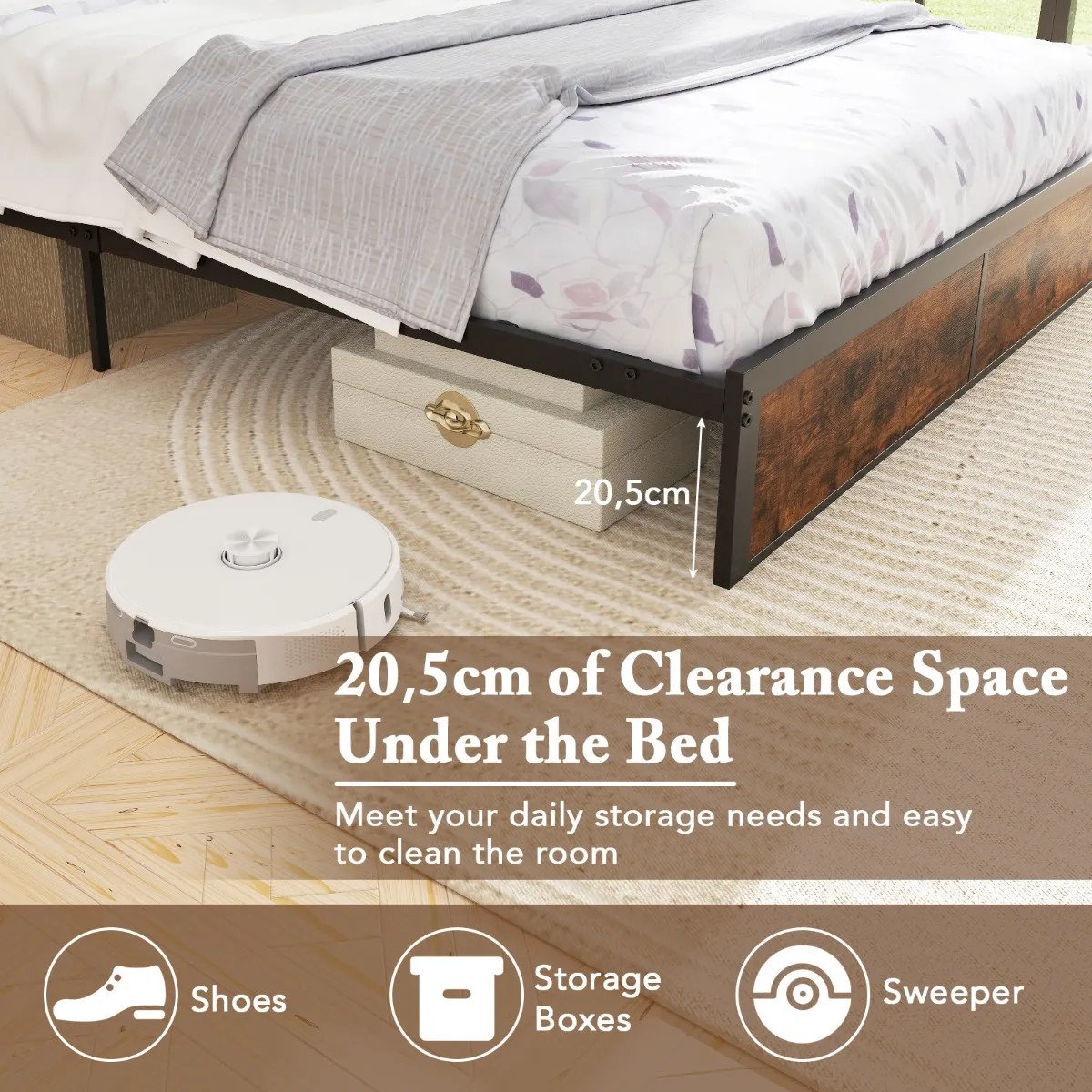 20,5 cm vrije ruimte onder het bed voor schoenen en opbergdozen