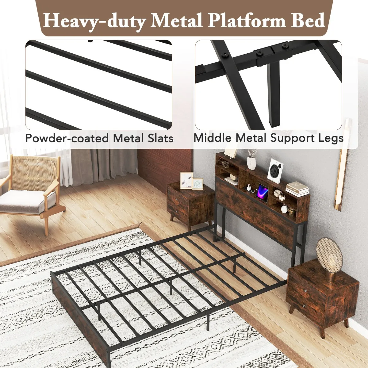 【Hoofdbord met veelzijdige opslag】: Het tweepersoons platform bed heeft een hoofdeinde met praktische opbergruimte voor het organiseren van benodigdheden voor het slapen gaan, zoals boeken, brillen, wekkers en telefoons, zodat ze gemakkelijk toegankelijk zijn.