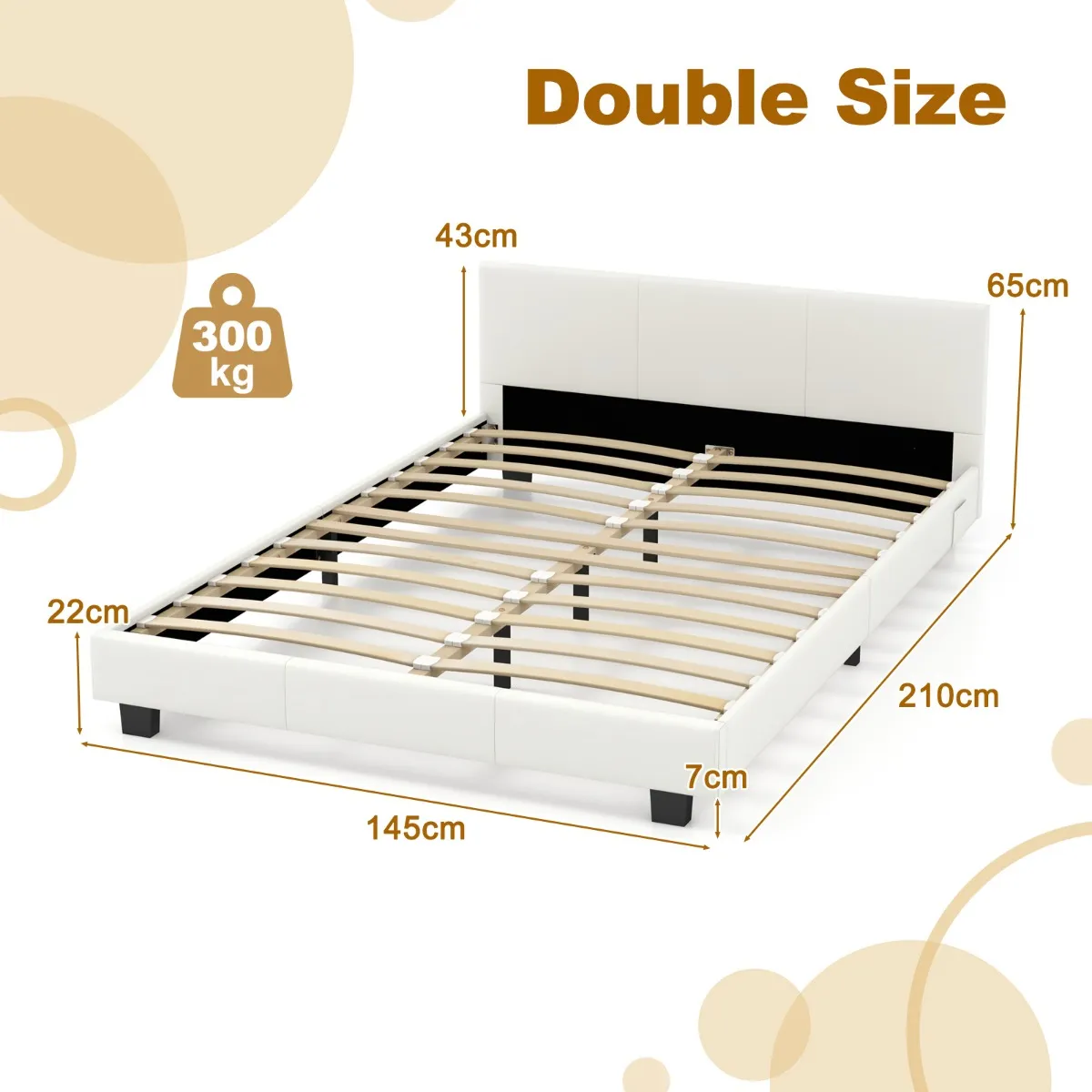 Robuuste constructie: Dit bedframe heeft een stevige houten structuur, versterkt met 5 extra metalen steunpoten voor maximale stabiliteit. Met een draagvermogen tot 300 kg is het duurzaam en betrouwbaar. Â