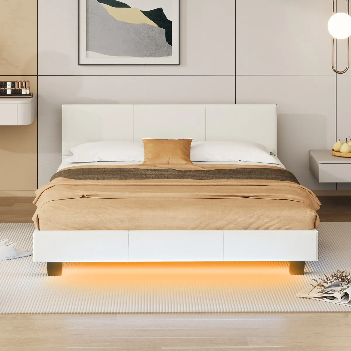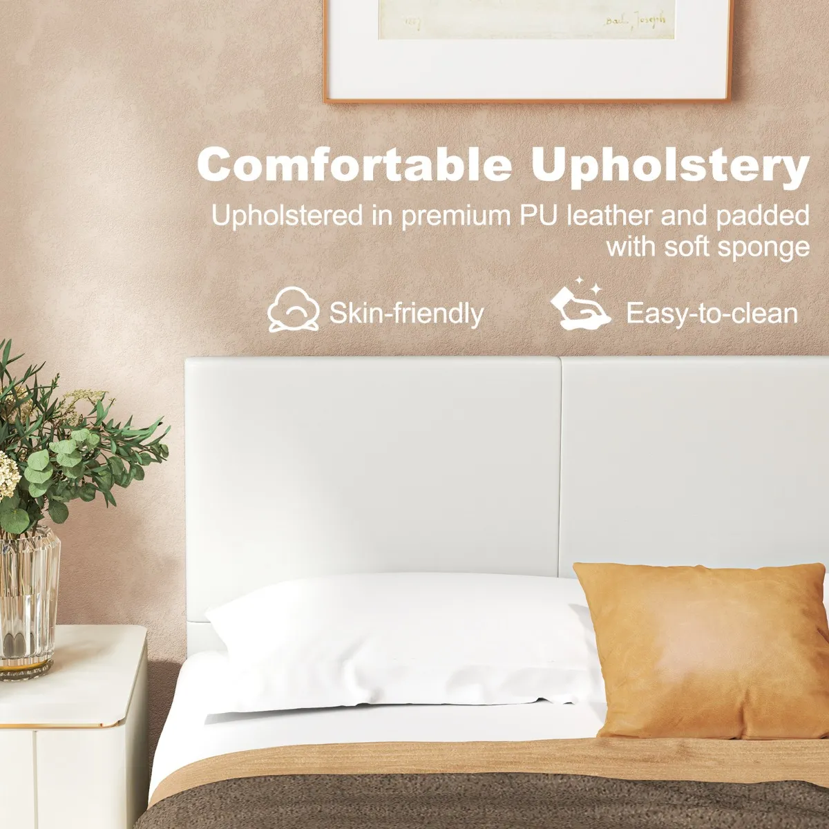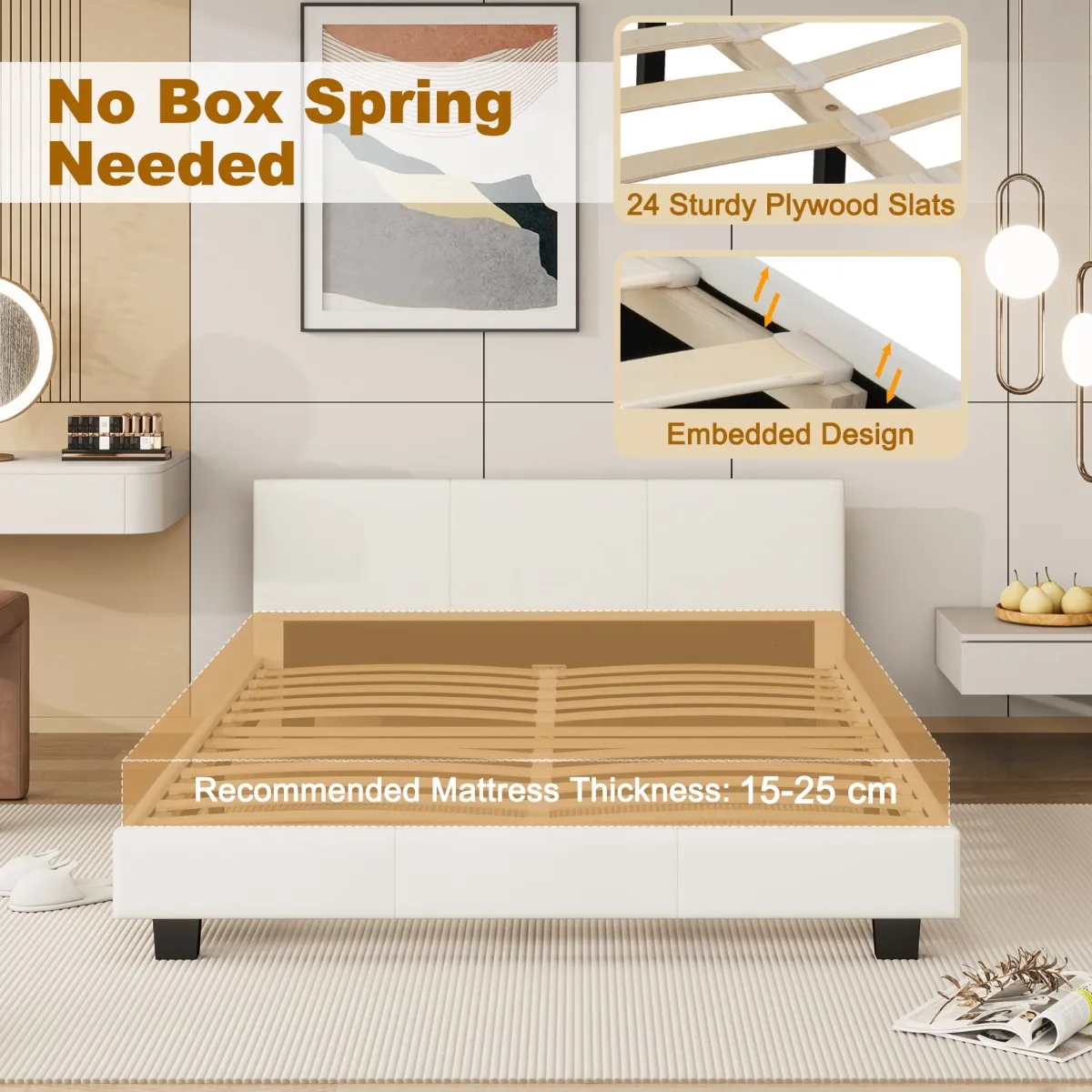 Comfortabele bekleding: Geniet van ultiem comfort met dit platformbedframe, bekleed met hoogwaardig PU-leer en voorzien van zachte schuimvulling. Het gladde witte kunstleer voegt verfijning en elegantie toe aan elke slaapkamer en biedt een perfecte plek om te ontspannen of een boek te lezen. Â