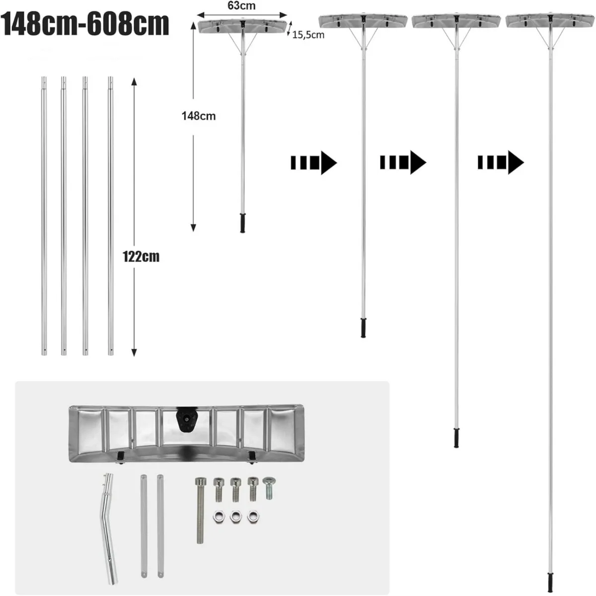 Onze verstelbare sneeuwhark van 1,48 tot 6 m met 1 handvat en 4 uitschuifbare stangen helpt u bij het sneeuwruimen en voorkomt dat u op het dak klimt. Het aluminium frame is stevig voor duurzaam gebruik en licht van gewicht voor eenvoudig gebruik en transport. Het 63 cm brede mes met twee wielen verbetert de efficiëntie van het sneeuwruimen en beschermt het dak tegen schade. Wanneer de hark niet wordt gebruikt, kan deze in verschillende compacte onderdelen worden gedemonteerd, waardoor opbergen erg handig is. Deze sneeuwhark is een perfecte aanvulling op uw winterseizoen.