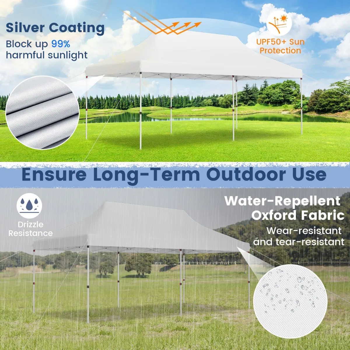 Met een afmeting van 300 x 600 cm en een verstelbare hoogte van 296/306/316 cm biedt ons tuinpaviljoen plaats aan 15 tot 20 personen. Door zijn veelzijdigheid is hij geschikt voor vele buitenactiviteiten. Hij wordt ondersteund door een stevig metalen frame en een luifel van Oxford-stof met zilveren coating die uitstekende bescherming tegen de zon biedt en langdurig gebruik garandeert. Het wordt geleverd met 12 metalen palen en 6 windtouwen om het stevig aan de grond te bevestigen. Dankzij het openklikbare ontwerp is de installatie eenvoudig en is opbergen handig in de meegeleverde draagtas.