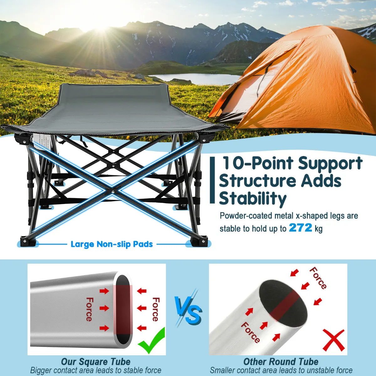 Stabiele structuur: Het veldbed heeft een stabiele X-vormige 10-punts structuur, waardoor een draagkracht van 272 kg gegarandeerd is. Door de vierkante metalen delen is een groter contactoppervlak en daardoor hoge stabiliteit gegarandeerd.