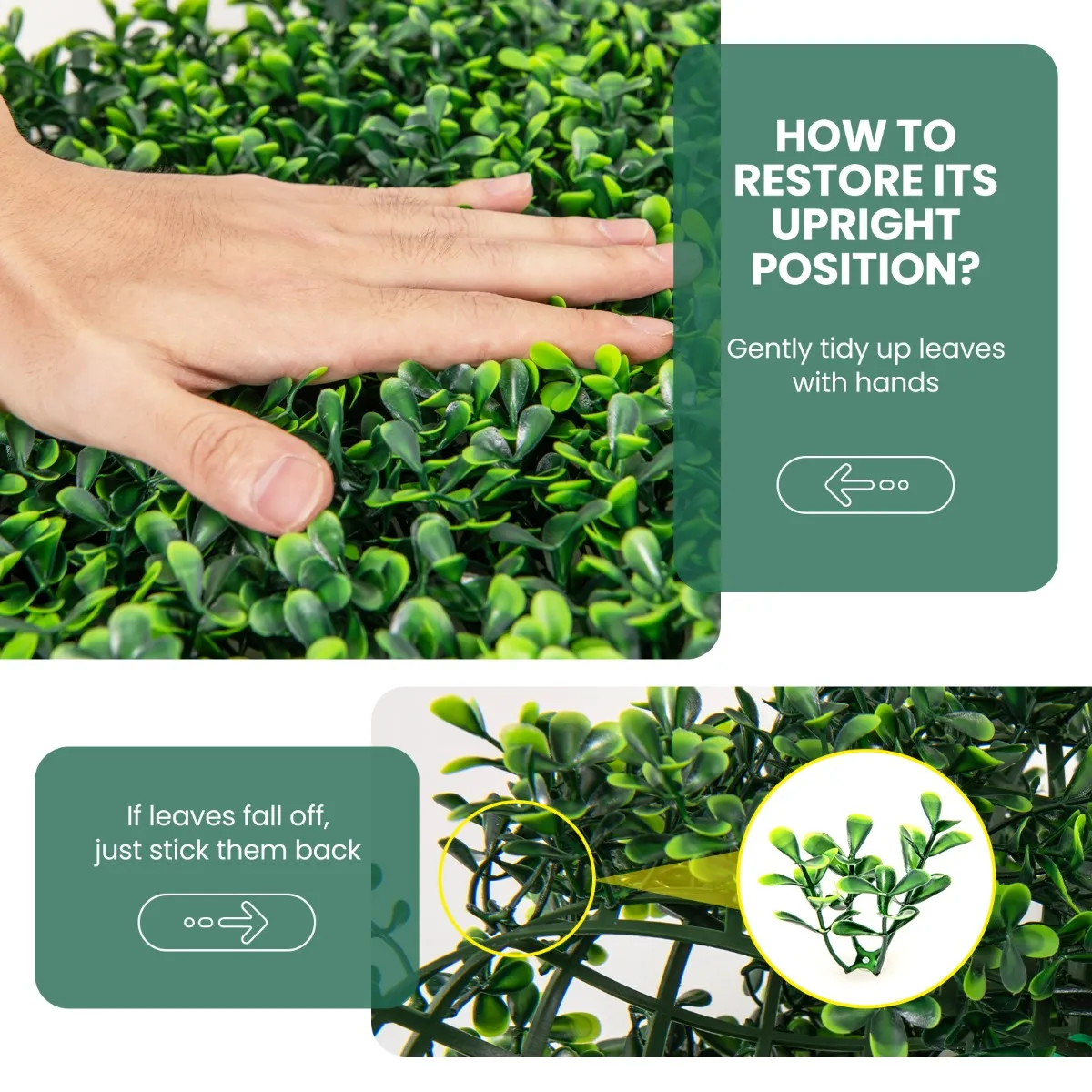 Onze kunsthaag bestaat uit 12 panelen van 50 x 50 cm kunst Buxus, met realistische kunstbladeren voor een weelderige uitstraling. De bladeren zijn gemaakt van geurloos, veilig, zon- en waterbestendig PE, waardoor ze duurzaam zijn en niet vervagen. De installatie is eenvoudig dankzij de innovatieve in elkaar grijpende verbindingsstukken. Het ontwerp kan in elke maat worden geknipt, zodat het op maat kan worden gemaakt. Of je nu je exterieur of je interieur wilt verfraaien, deze synthetische panelen zijn praktisch en onderhoudsvrij.