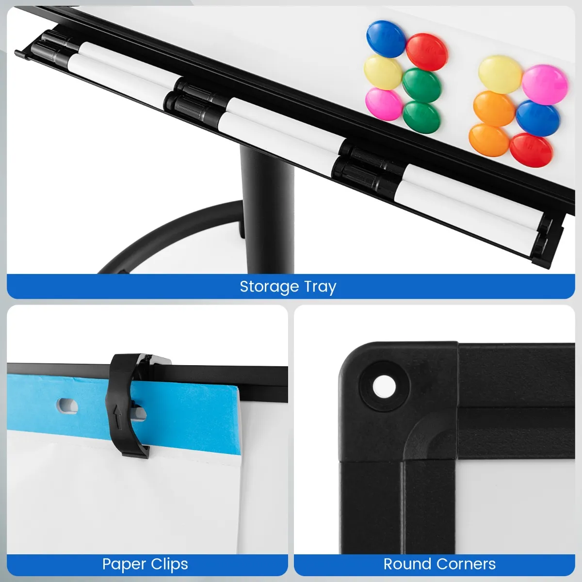 Dit magnetische whiteboard is ideaal om op te schrijven en tekenen, en is ideaal voor lesgeven of presentaties. Het pakket bevat 12 magneten, 6 markers, 2 paperclips en een papieronderlegger van 25 vellen voor eenvoudig gebruik. Plus 1 magnetisch gumblok om eenvoudig te wissen. Het in hoogte en hoek verstelbare ontwerp voldoet aan verschillende behoeften. De opberglade houdt al je accessoires netjes georganiseerd. De 5 360° zwenkwielen zorgen voor een soepele beweging en zijn ook vergrendelbaar. De ronde basis houdt hem stabiel.