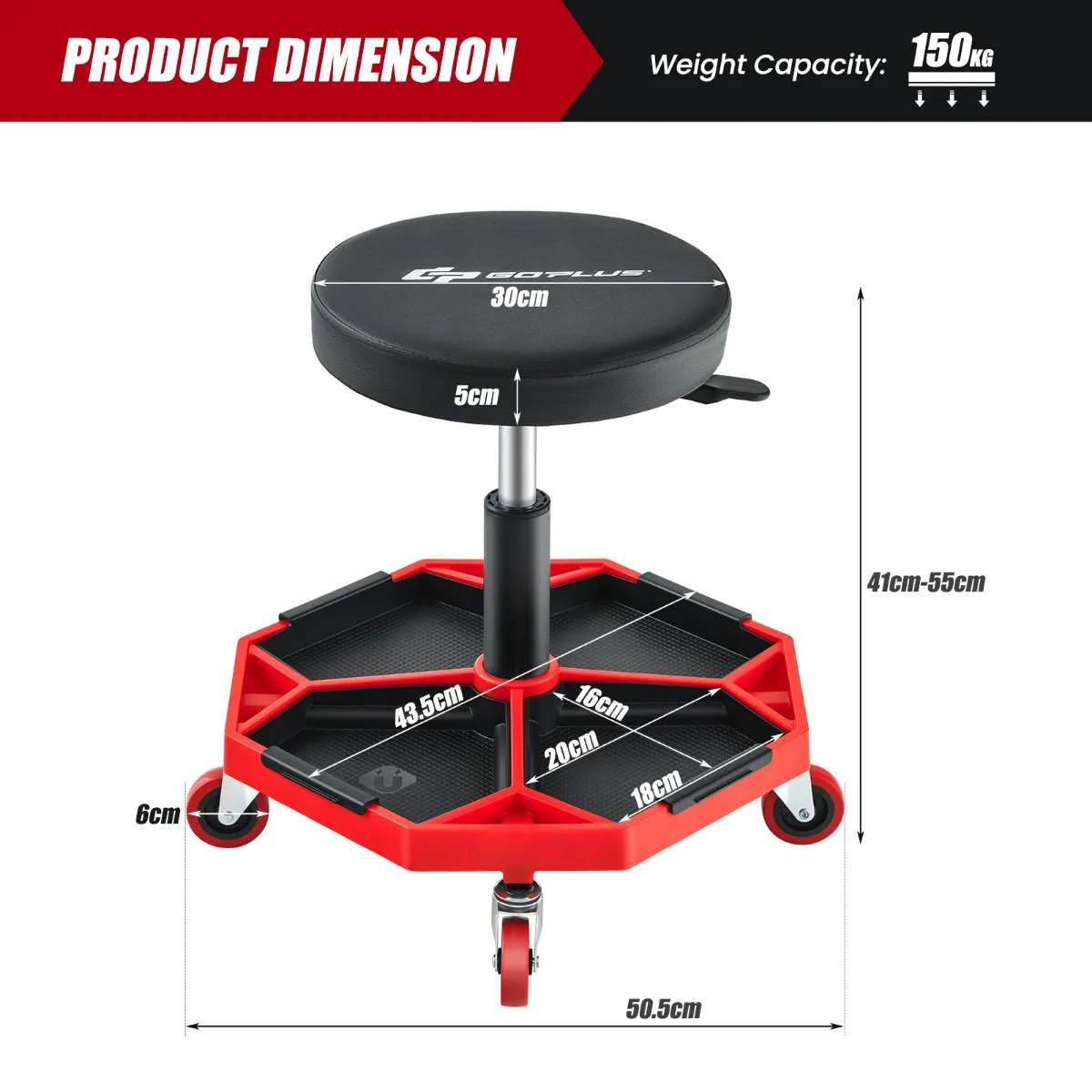 Na eenvoudige installatie is deze rollende stoel klaar om u te helpen bij het repareren van auto’s of het hanteren van andere projecten. De instelbare hoogte van 41 tot 55 cm en de laadcapaciteit van 150 kg maken het geschikt voor de meeste gebruikers. Wanneer u erop zit, voelt u zich direct comfortabel en ontspannen dankzij de zachte gestoffeerde zitting. Als er meer banden gerepareerd moeten worden, verplaats deze kruk dan eenvoudig met 4 zwenkwielen. Bovendien draait de zitting voor extra gemak. De grote gereedschapsbak met 4 verwijderbare frames stelt u in staat om de gereedschappen die u nodig heeft binnen handbereik te houden. Eén van de frames is magnetisch voor betere opslag van kleine gereedschappen.
