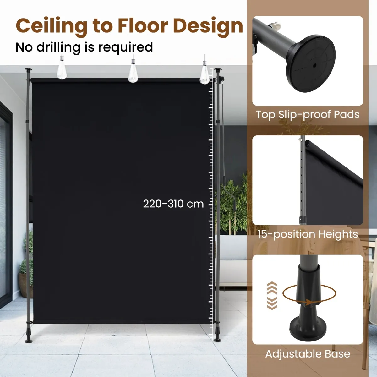 Zonder boren en in hoogte verstelbaar: De vrijstaande zonwering is in hoogte verstelbaar van 220 tot 310 cm, zodat het past bij verschillende plafonds. Antislip pads aan het plafond en een stevige voet zorgen voor stabiliteit – zonder schroeven of boren.