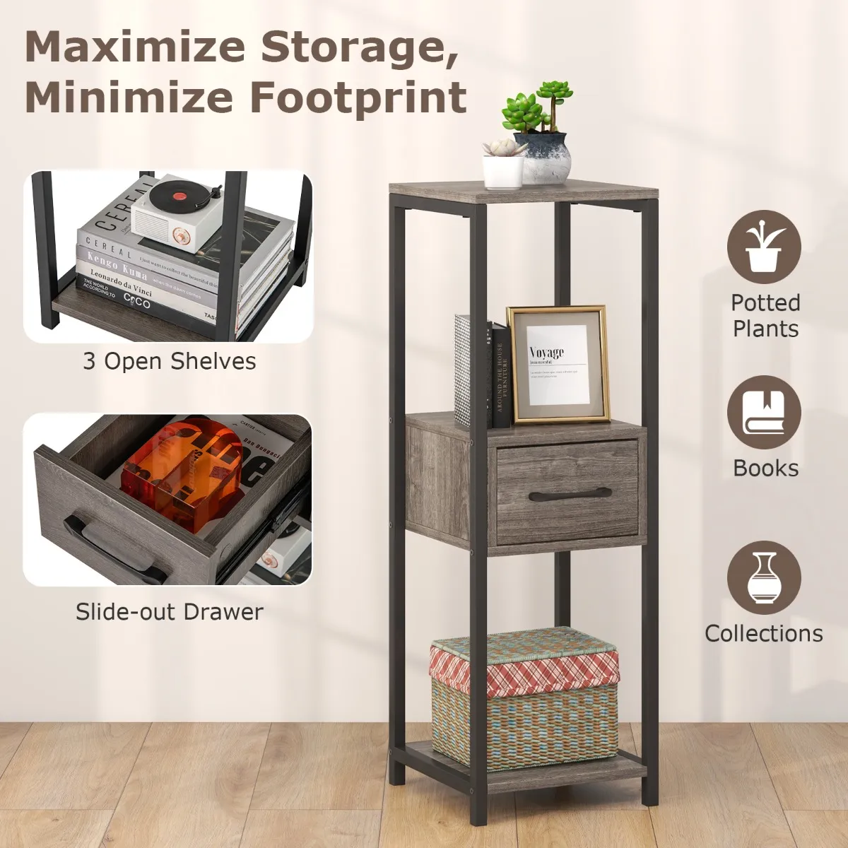 Deze plantenstandaard met 3 open planken biedt een nette manier om je favoriete potplanten uit te stallen. En de lade kan gereedschap of belangrijke voorwerpen op hun plaats houden. Hij is veelzijdig en kan ook worden gebruikt als displayplank. Met 2 kantelbeveiligingen kun je hem aan de muur verankeren voor extra stabiliteit. Het gepoedercoate metalen frame is gecombineerd met anti-slip glijders, die zorgen voor superieure stabiliteit zonder krassen op je vloer. Met de gesimuleerde houtnerf is de ruimtebesparende verticale plantenplank een geweldige keuze voor elke kamer.