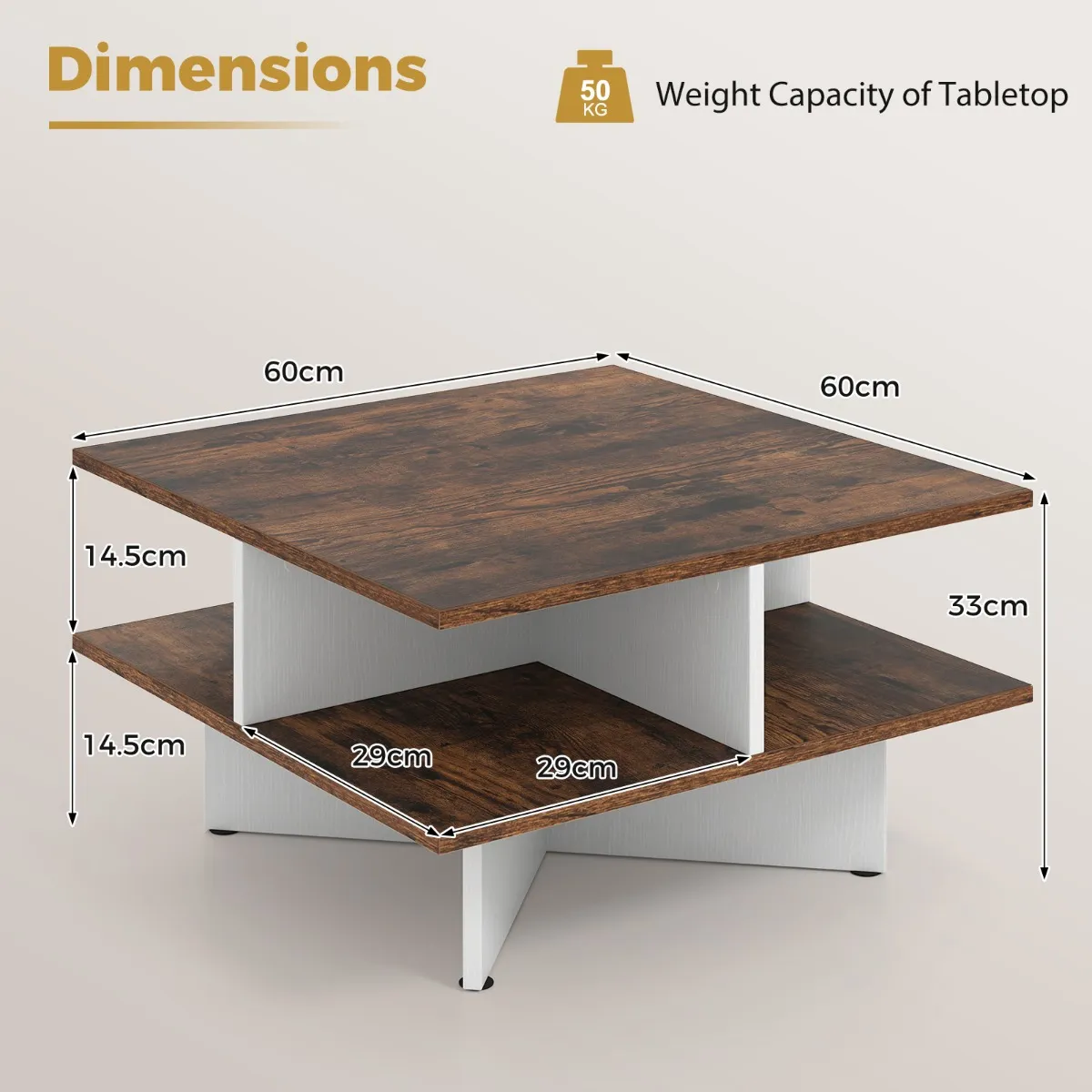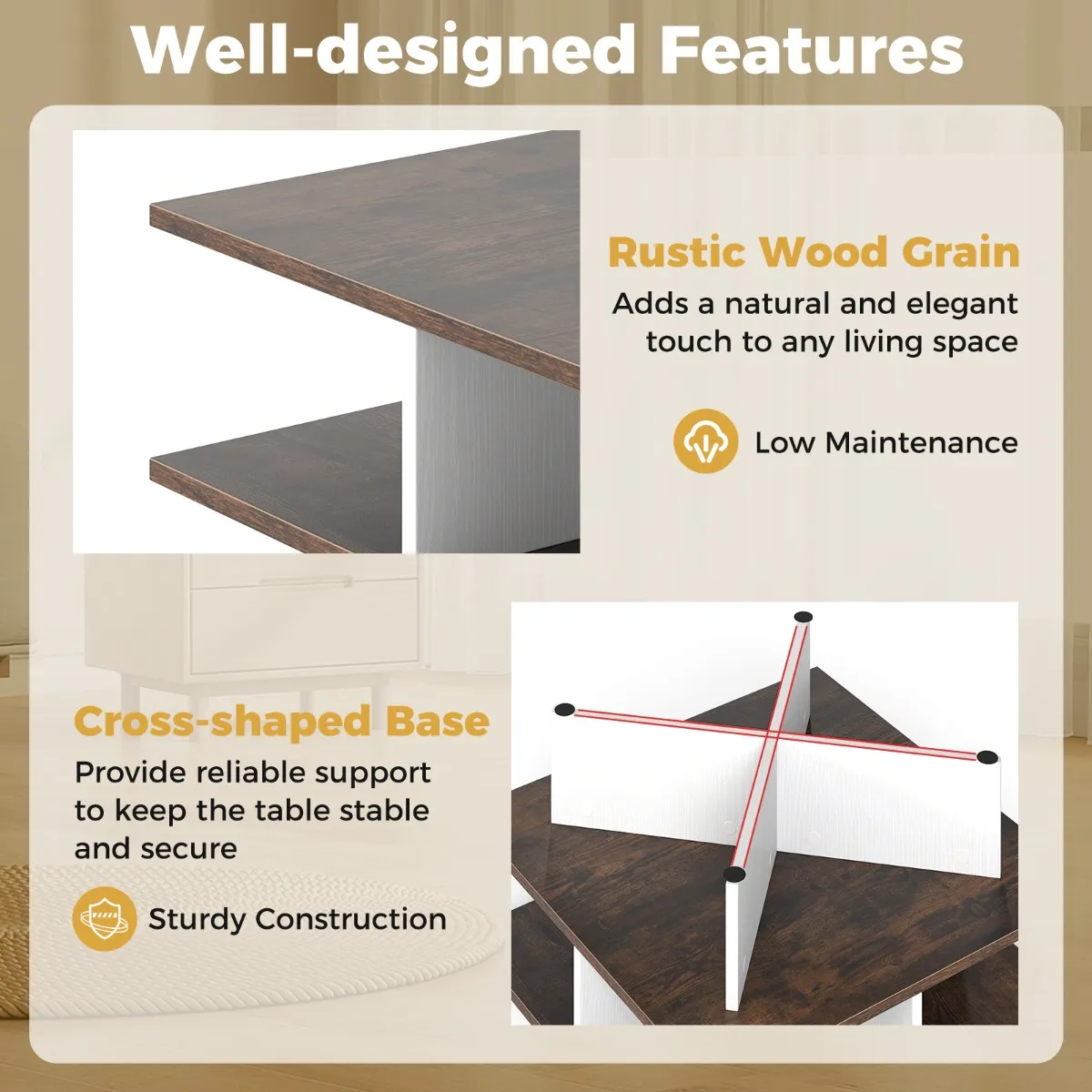 【Gebouwd om lang mee te gaan】: Gemaakt met een dubbele kruisstructuur kan deze centrale tafel met 2 niveaus met gemak tot 50 kg dragen. De anti-slip glijders zorgen voor een onfeilbare stabiliteit en beschermen je vloer tegen krassen.