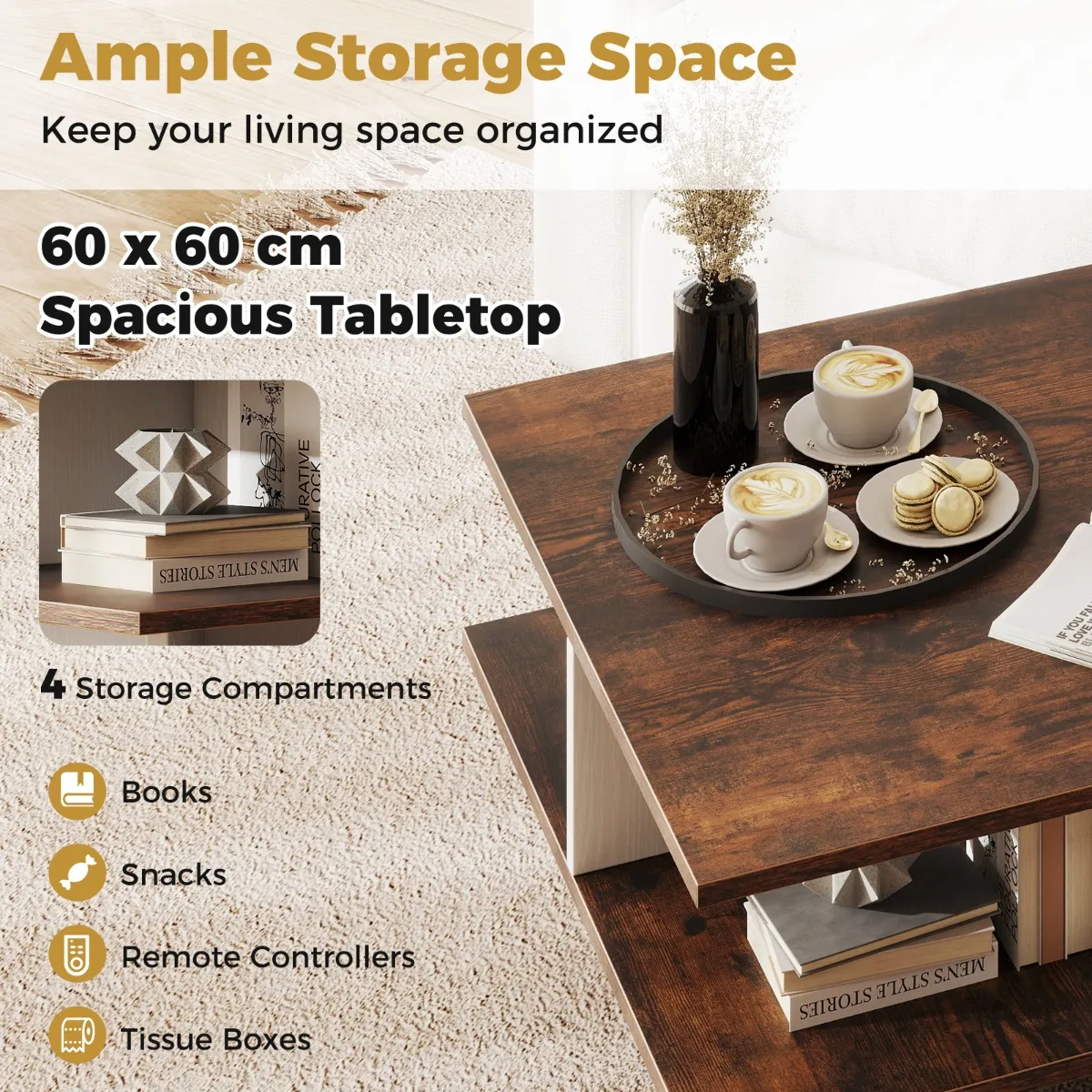 【Benut je ruimte optimaal】: Deze vierkante salontafel is niet alleen een pronkstuk, maar ook een opbergoplossing! Met zijn ontwerp op 2 niveaus, ruime blad van 60 x 60 cm en 4 opbergvakken houdt hij je benodigdheden georganiseerd en binnen handbereik.