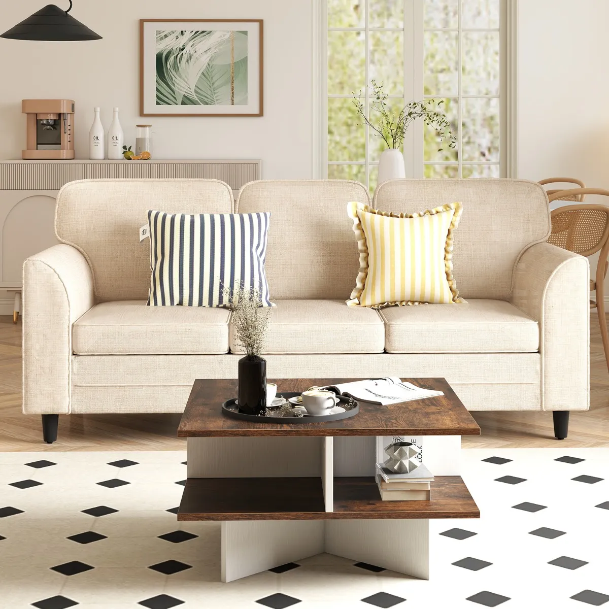 Ontdek deze elegante salontafel, die dankzij de structuur met twee niveaus een uitzonderlijke opbergoplossing is. Met een ruim tafelblad, vier slimme opbergvakken en een stevig dubbel kruisvoetstuk is dit meubelstuk meer dan zomaar een salontafel: het zal een revolutie teweegbrengen in uw comfortabele en opgeruimde leefruimte. Met zijn rustieke houten afwerking en elegante, eenvoudig te reinigen design combineert dit multifunctionele wonder ouderwetse charme met modern comfort in elke kamer, of u nu gasten ontvangt, werkt of gewoon van een hapje geniet.
