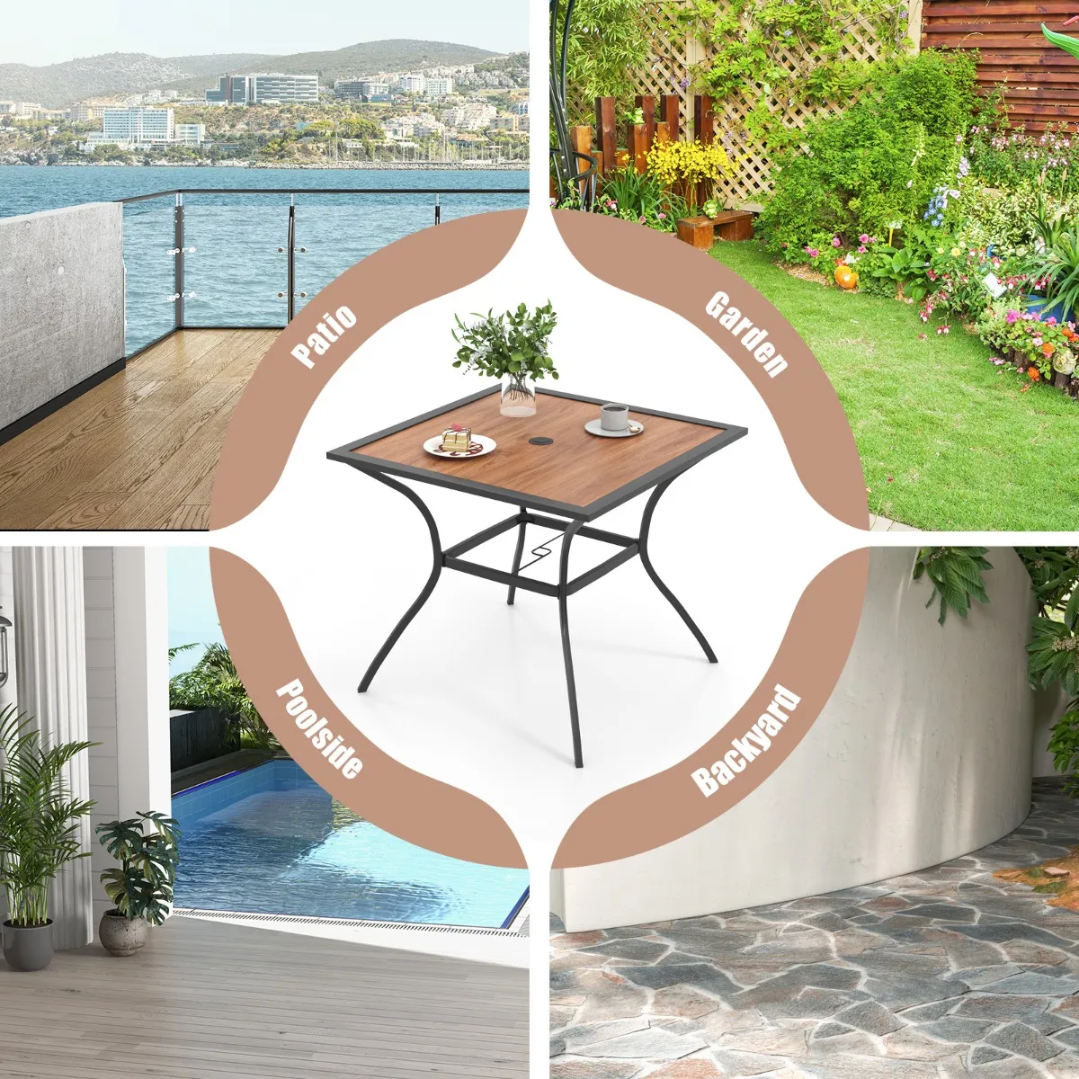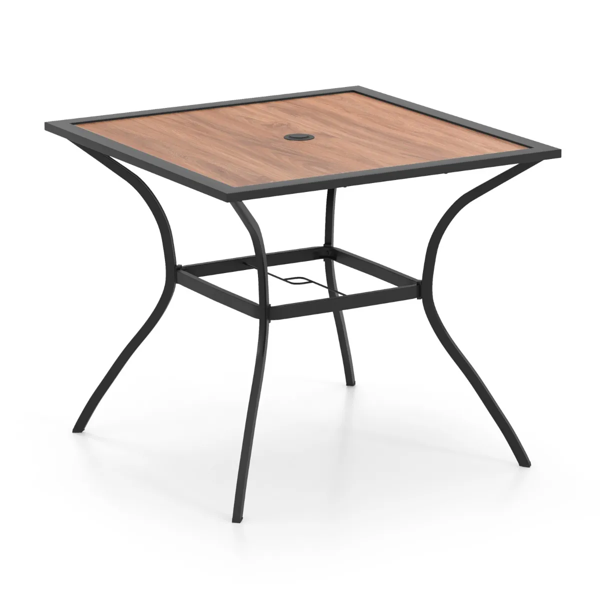 Deze vierkante terrastafel heeft een bovenblad van imitatiehout dat bestand is tegen verbleken en hitte, waardoor hij tijdloos mooi en functioneel is. Met een parasolgat van 4 cm is hij geschikt voor verschillende parasols (niet inbegrepen). Bovendien zorgt het stevige metalen frame met gebogen steunpoten voor stabiliteit. Met genoeg ruimte voor 4 personen is deze eettafel voor buiten perfect voor een gezellig samenzijn in de tuin, op het terras of bij het zwembad.