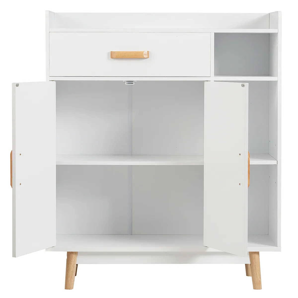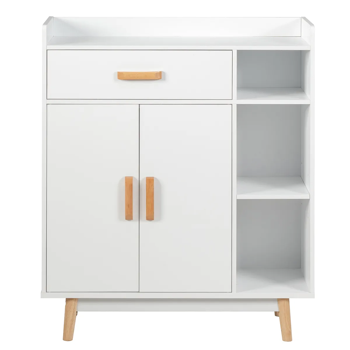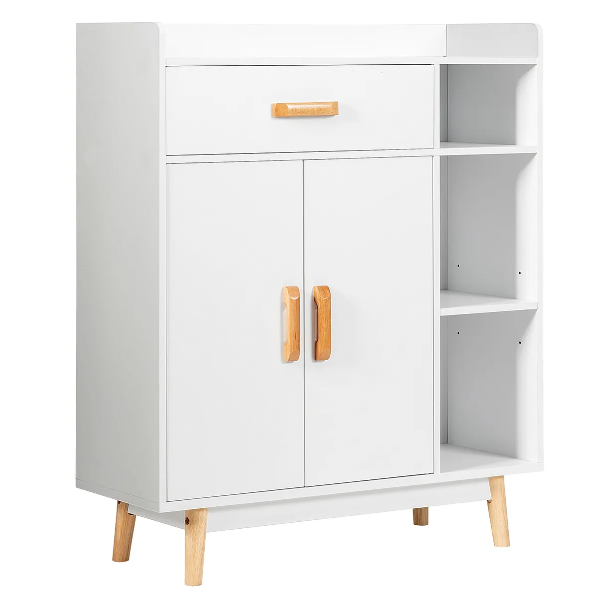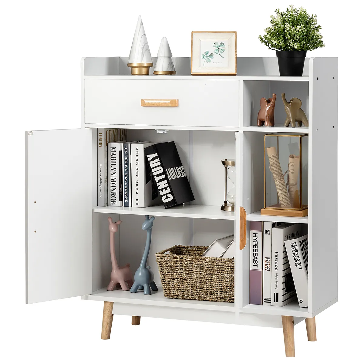 Deze kast is gemaakt van hoogwaardige materialen en wordt ondersteund door rubberen houten poten, die jarenlang kunnen meegaan. De grote lade biedt een eigen opbergruimte voor sokken, ondergoed of sieraden en de dubbel deurkast met een verstelbare plank is geschikt voor het opbergen van boeken, documenten, enz. Bovendien kunt u ambachten op drie open planken tonen. Met een stijlvolle uitstraling kan de opbergregelaar unieke uitstraling geven aan uw woonkamer, slaapkamer, portiek en diverse plaatsen.