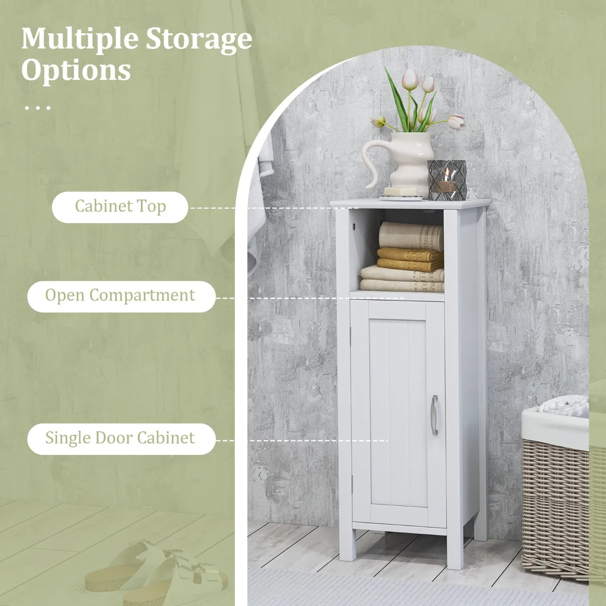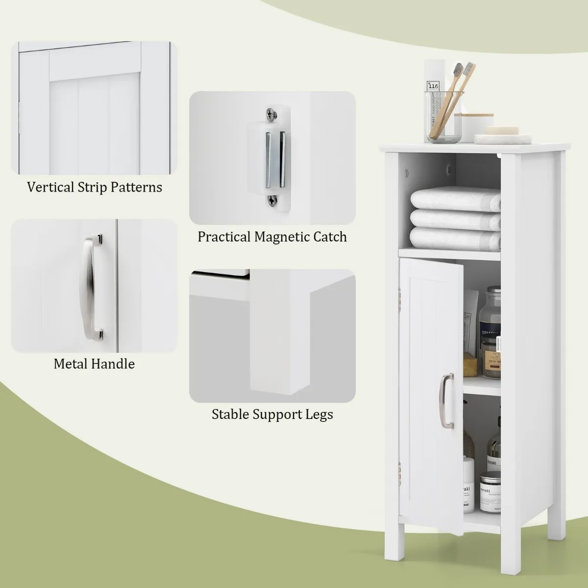 Dit is onze eenvoudige en stijlvolle opbergkast. Het is gemaakt van MDF, wat waterdicht en duurzaam is. Premium materiaal en robuuste structuur geven je een perfecte kast voor duurzaamheid en een lange levensduur. Een grote opslagruimte kan u helpen uw items beter te classificeren. Het open bovenste compartiment van de kast kan worden gebruikt om sommige items voor dagelijks gebruik op te bergen, en uw extra items kunnen achter de deur worden geplaatst. De opbergkast heeft een in hoogte verstelbare plank om aan uw opbergbehoeften voor items van verschillende hoogtes te voldoen. Deze elegante kast is een ideale oplossing voor badkamers, keukens, woonkamers en slaapkamers. Trouwens, met antikantelvoorzieningen is deze kast veilig te gebruiken.