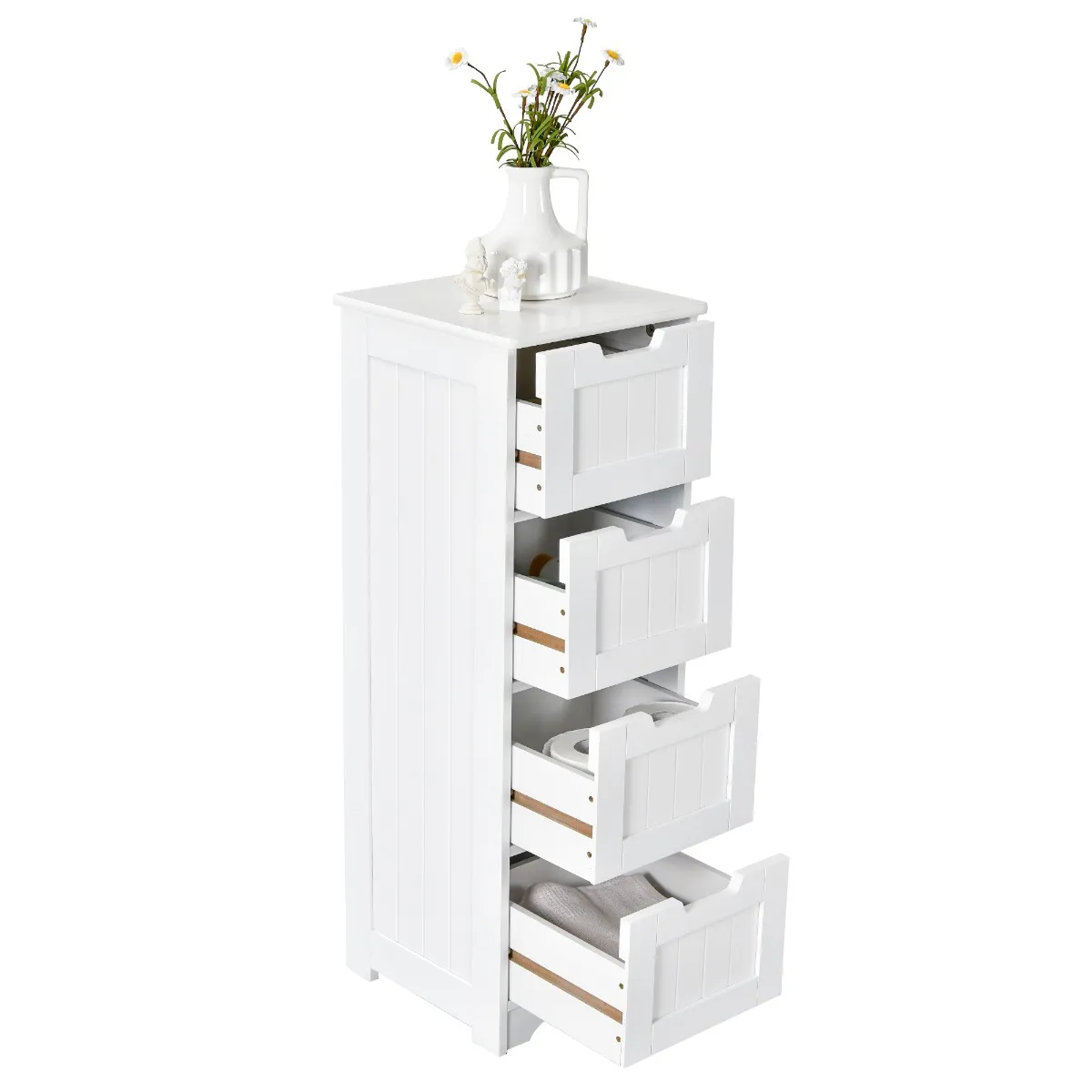 Deze badkamervloerkast met 4 laden is ideaal voor uw slaapkamer, badkamer, woonkamer, kantoor en meer. Op het tafelblad kun je je boeken, lampen en meer kwijt, terwijl de 4 diepe lades voldoende opbergruimte bieden voor je toiletartikelen, toiletartikelen, medicijnen en andere huishoudelijke accessoires, zodat je huis netjes en opgeruimd blijft. Hoogwaardig MDF-materiaal zorgt voor een lange levensduur. De opbergkast kan een maximaal draagvermogen van maximaal 50 kg dragen, en elke lade kan maximaal 5 kg dragen. Bovendien is de achterkant van deze kast voorzien van kantelbeveiligingen die voor veilig gebruik aan de muur kunnen worden bevestigd. Deze veelzijdige vloerkast past goed bij elke interieurstijl en zorgt ervoor dat je huis perfect georganiseerd blijft.