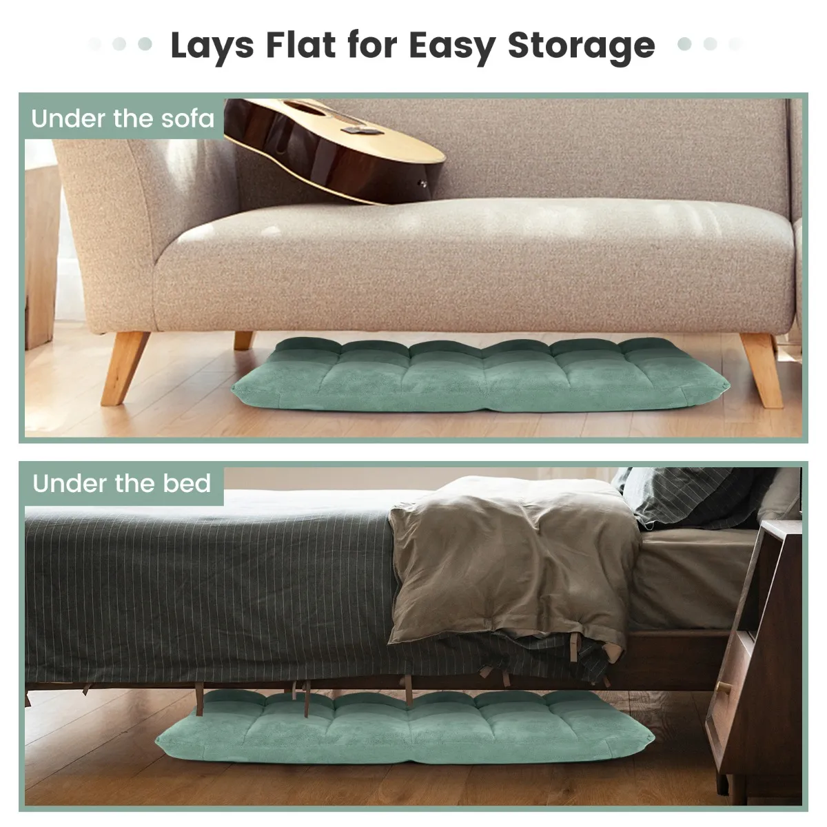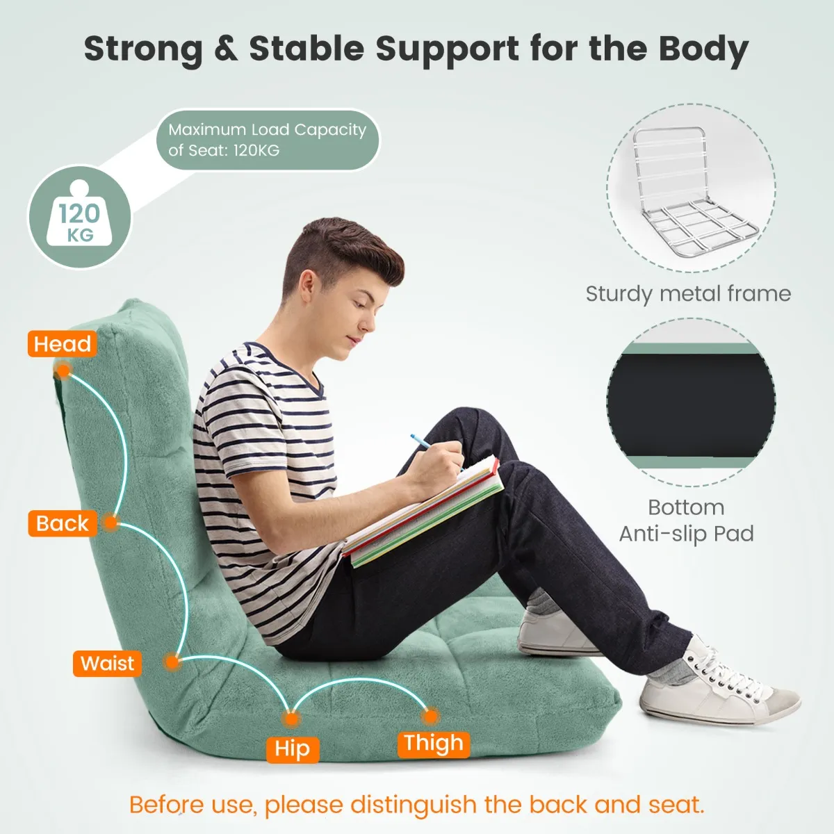 Bekleed met huidvriendelijk koraalfluweel en opgevuld met zeer elastische spons, biedt deze vloerstoel u een heerlijke zitervaring, alsof u in de zachte lucht ligt. Bovendien kun je de rugleuning in 14 verschillende posities verstellen, zodat je boeken kunt lezen, tv kunt kijken, spelletjes kunt spelen etc. Dankzij het stevige metalen frame en het draagvermogen van 90 kg hoef je je geen zorgen te maken over vervorming of omvallen. Leg hem eenvoudig plat op de vloer als hij niet wordt gebruikt. Het compacte formaat past perfect in de beperkte ruimte onder je bank of bed.