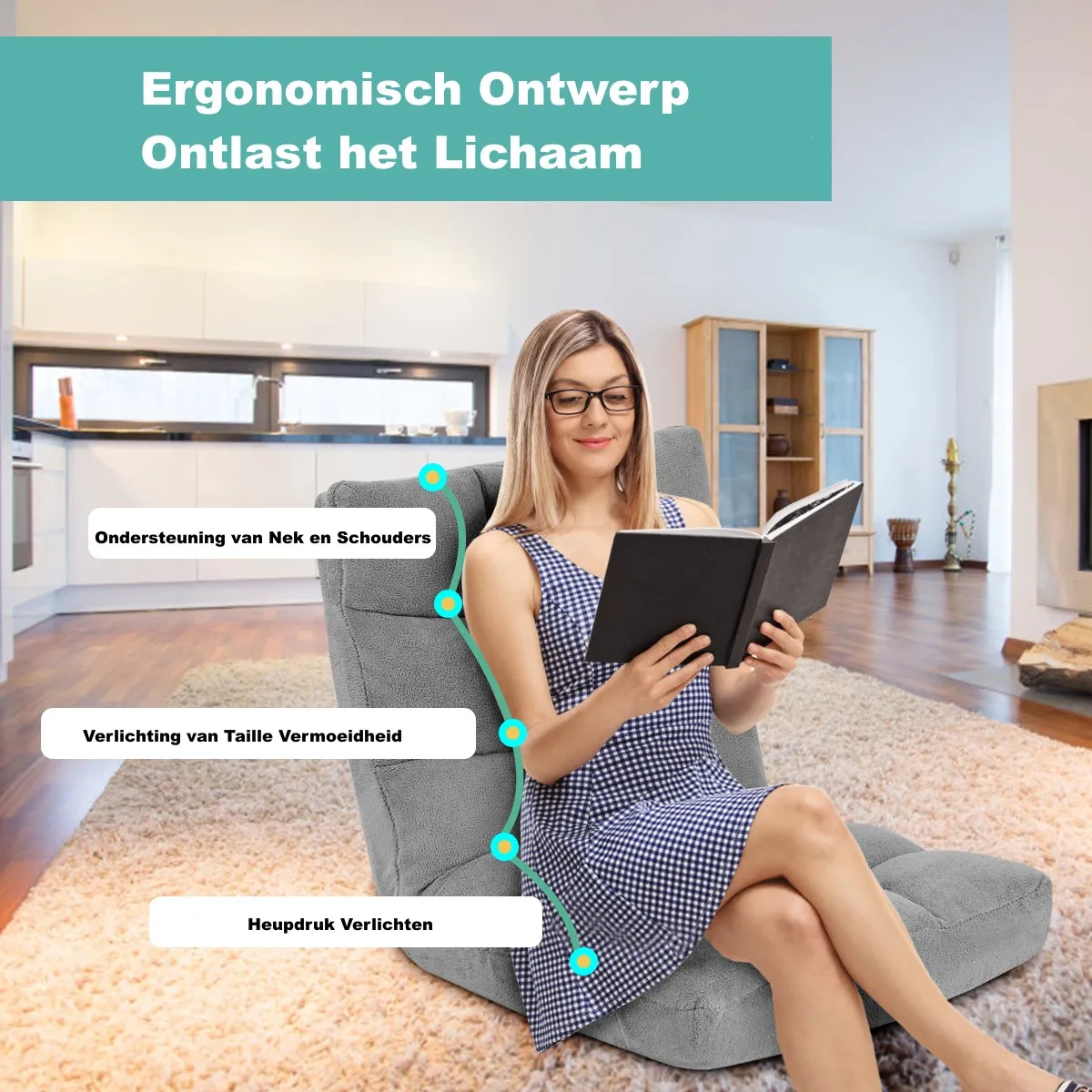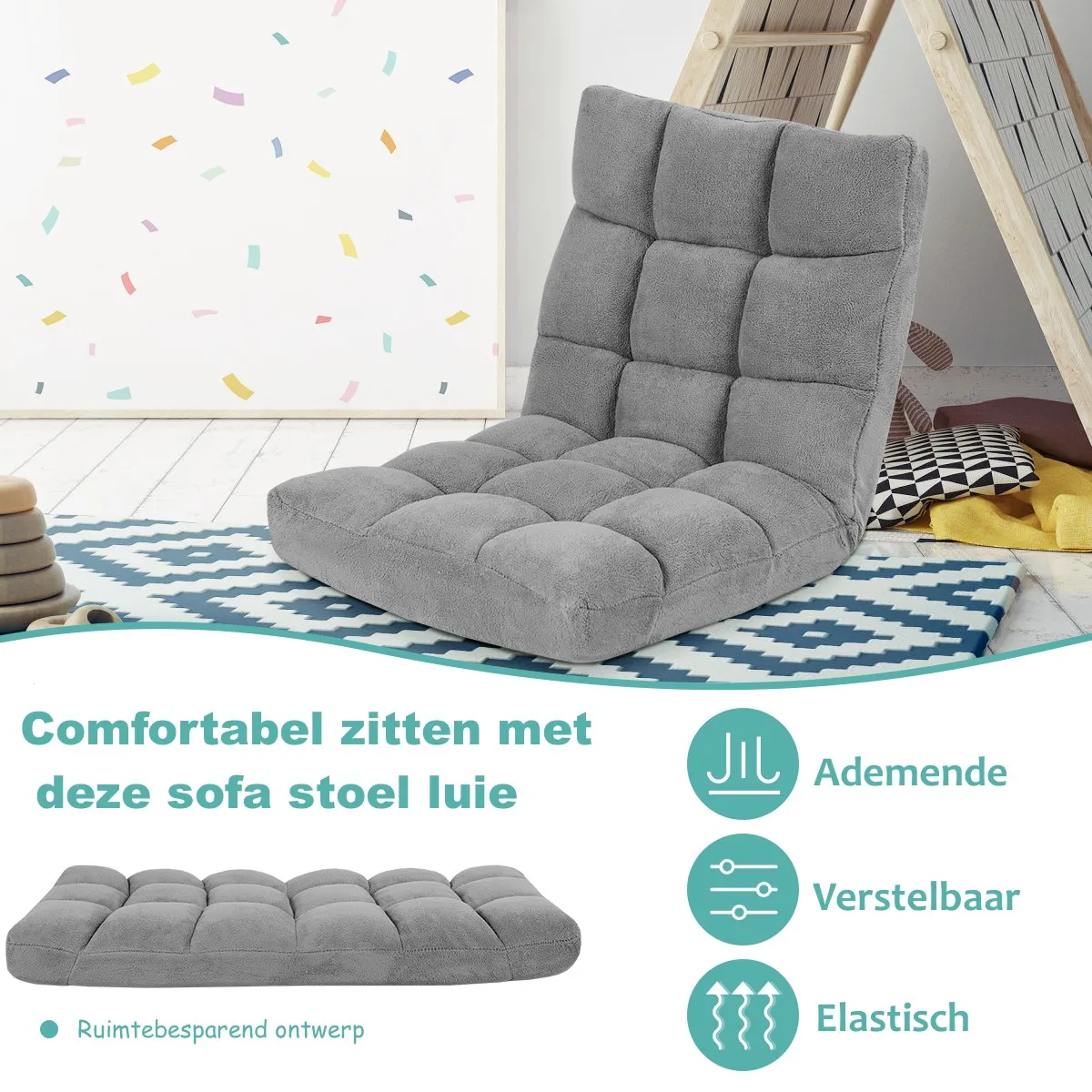Opvouwbaar ontwerp – De vloerstoel kan gemakkelijk worden vervoerd dankzij het lage gewicht van 6 kg. Als u meer ruimte wilt besparen, is deze eenvoudig op te bergen dankzij het opvouwbare ontwerp. De vloerstoel kan plat onder een bed worden gelegd. Dit biedt u veel gemak.