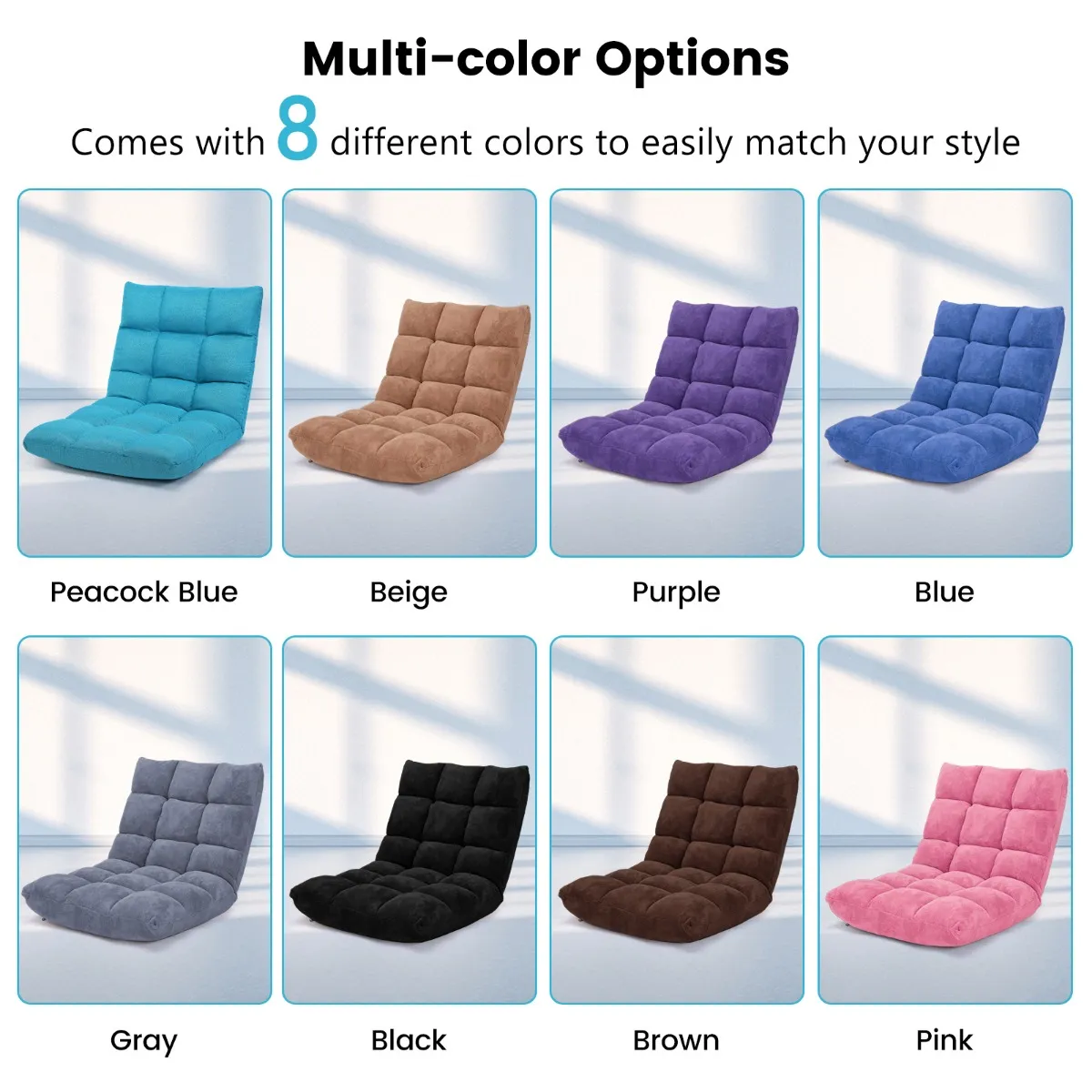Met zijn 14 verschillende standen past deze luie stoel zich gegarandeerd aan uw comfort aan. Het is gemaakt met een bekleding van koraalfluweel en kussens van geheugenschuim die veel comfort bieden door zich aan te passen aan de vorm van je lichaam en drukpunten te verlichten. Leg de fauteuil gemakkelijk volledig plat om hem onder het bed op te bergen. Het lichtgewicht en compacte ontwerp maakt het gemakkelijk om van kamer naar kamer te vervoeren. De stoel is perfect geschikt voor meditatie, het spelen van videogames, tv kijken, werken met laptop, lezen, en ideaal voor woonkamer, slaapkamer, balkon, enz. Geweldig om extra zitplaatsen toe te voegen wanneer vrienden en familie langskomen om het spel te bekijken!