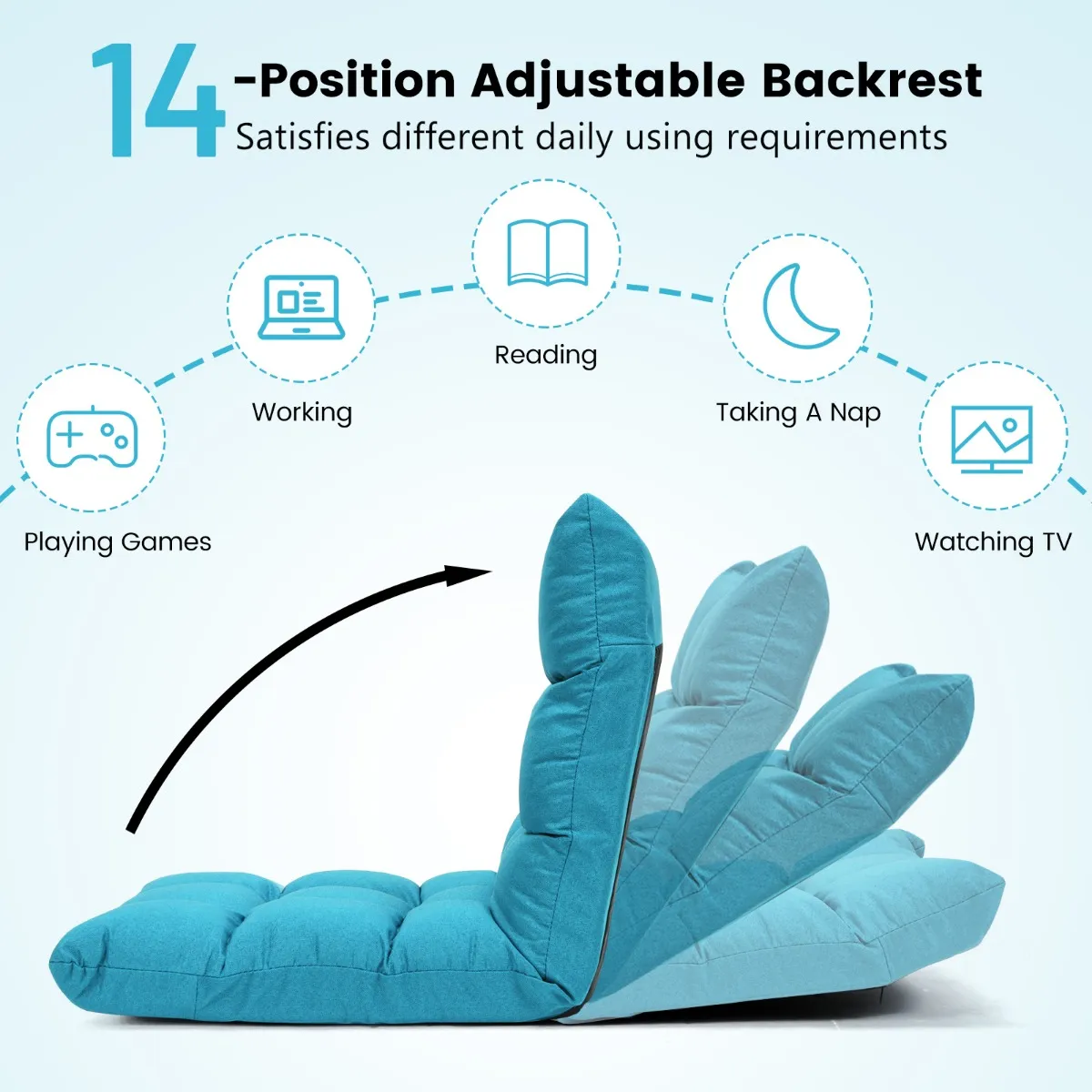 【Verstelbare vloerstoel met 14 standen】Stel de stoel eenvoudig in 14 verschillende posities in om op uw lichaam te passen en zo goed mogelijk aan het brede gebruik te voldoen, zodat u de stoel plat kunt leggen om een dutje te doen, longue om tv te kijken, ontspannen met een kopje koffie drinken, comfortabel mediteren of op 90 graden gebruiken om bord- / videogames te spelen.
