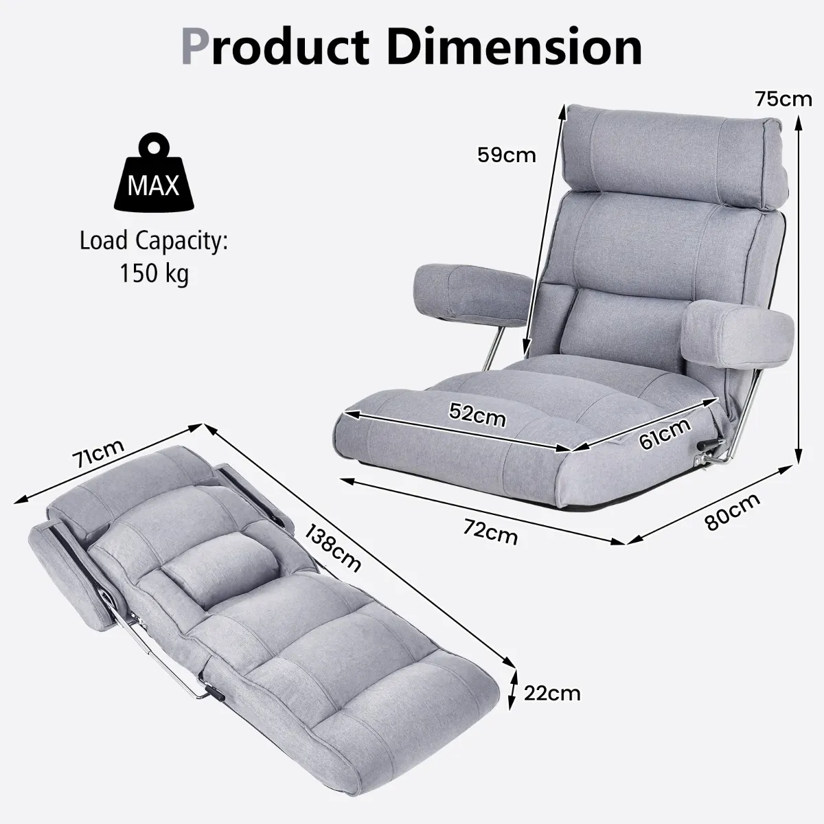 Wil je genieten van een gezellige pauze, maar weet je niet waar je moet beginnen? Neem een kijkje op onze gezellige opvouwbare vloerstoel! Gemaakt van hoogwaardige materialen, is deze stoel stabiel en comfortabel om op te zitten. Het ademende stoffen oppervlak en de zachte zitting zullen je vermoeidheid verdrijven. Bovendien maakt de verstelbare rugleuning, voetensteun, lendenkussen en hoofdsteun deze stoel perfect om te ontspannen, te lezen of tv te kijken. De opklapbare armleuningen bieden extra comfort en opbergruimte.