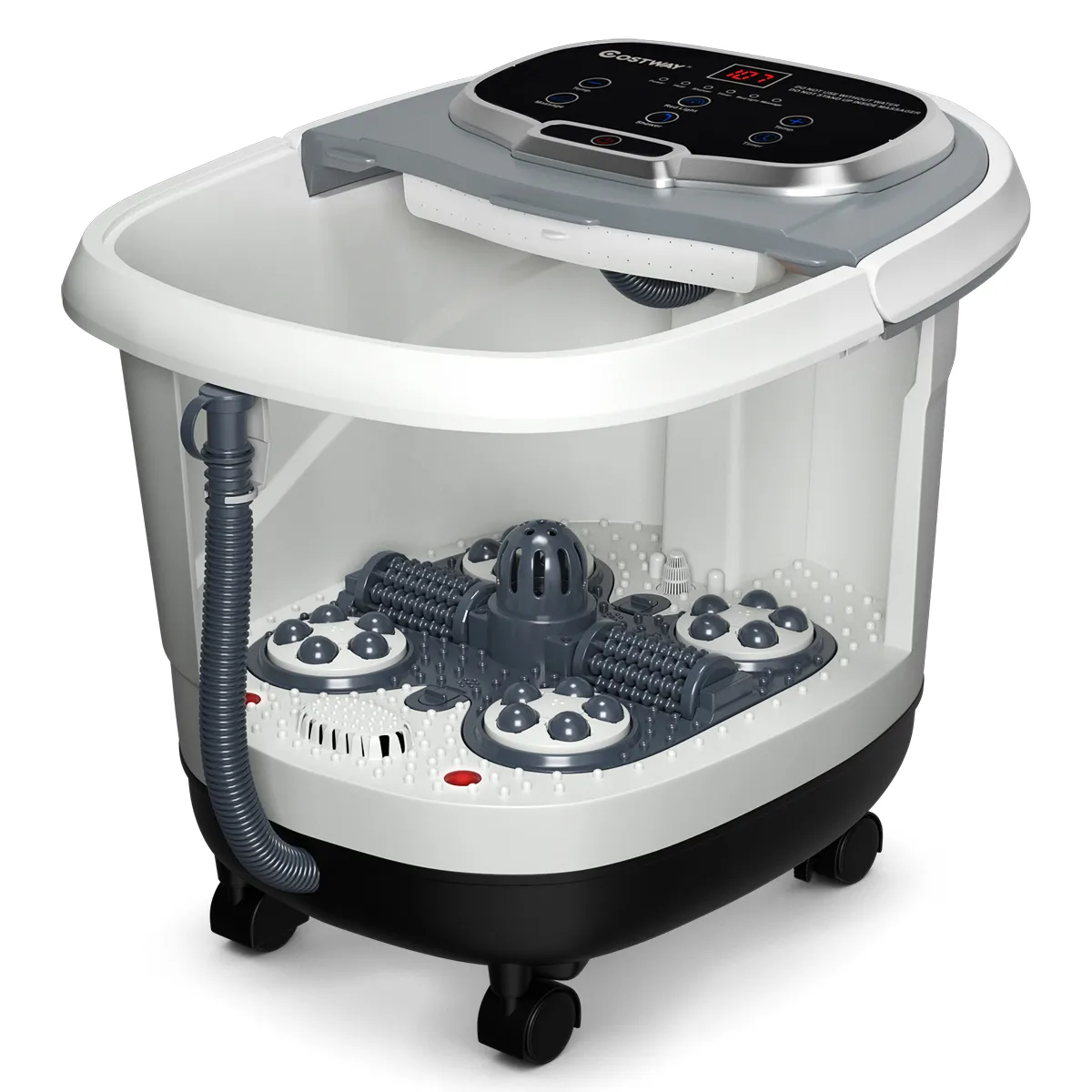 Onze voetenbadstimulator is geschikt voor het hele gezin en kan uw levenskwaliteit aanzienlijk verbeteren. Dankzij de 6 gemotoriseerde massagerollen en de douchefunctie kan het de bloedsomloop effectief stimuleren en stress op de kuiten en voeten verlichten, terwijl het pijn verlicht en de meridianen glad maakt. De combinatie van het rode licht en de medicijndoos kan ook het therapeutische effect vergroten en tegelijkertijd zwelling, kloppende pijn en roodheid verminderen. U kunt de temperatuur en tijd vrij instellen volgens uw behoeften. Het afneembare massageoppervlak is eenvoudig te verwijderen en schoon te maken, waardoor u tijd en geld bespaart. Bovendien helpen de verborgen handgreep en de vier universele wielen in combinatie om het apparaat soepel te verplaatsen. Ontspan je hele lichaam met deze foot spa massager!