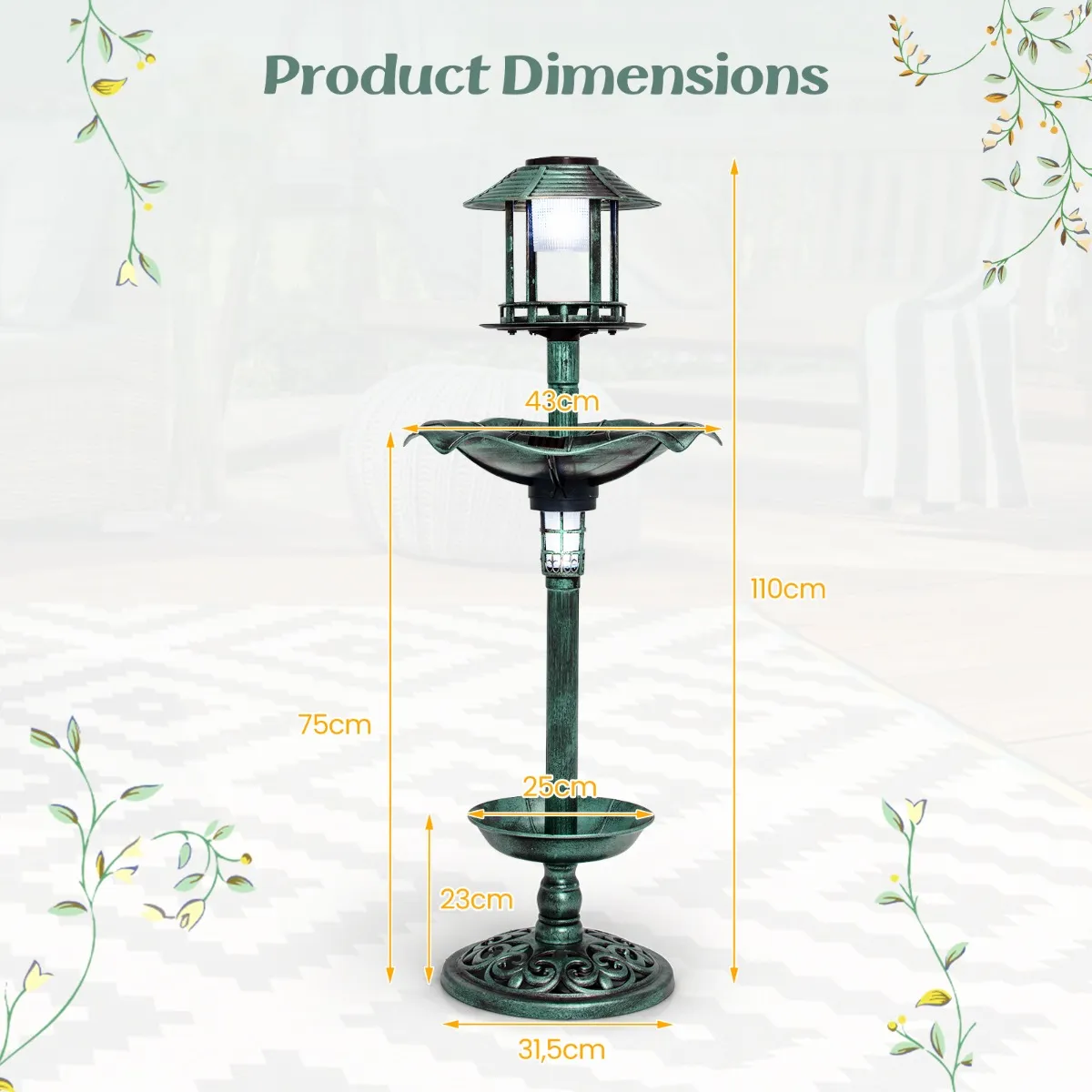 Ons vogelvoederhuisje heeft een voederbak en lampjes om je tuin ’s avonds te verlichten. Er zit een verwijderbaar zonnepaneel bovenop en een geïntegreerd zonnepaneel op de schaal, die automatisch opladen. Het wordt geleverd met een grote leliebladkom waar de vogels in kunnen drinken en baden, en de voederbak met deksel zorgt ervoor dat de zaden droog blijven. Om de windbestendigheid te verbeteren kun je zand, stenen of andere verzwaarde voorwerpen in de holle basis leggen en de meegeleverde grondpennen gebruiken om het te verankeren.