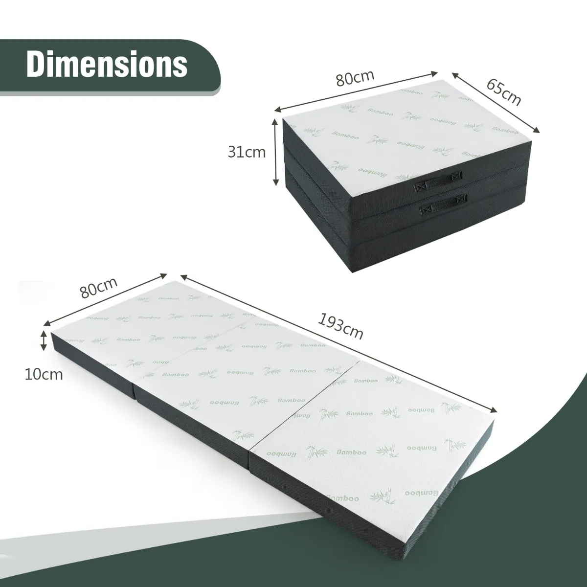 Als je een logeergast hebt, is dit opvouwbare matras een goede keuze! Het kan gemakkelijk worden opgevouwen om ruimte te besparen of kan worden uitgeklapt voor gebruik. Er zijn klittenbandriemen om de 3 stukken bevestigd te houden en gemakkelijk vast te pakken handvatten voor probleemloos dragen. Daarnaast is de samenstelling van 10 cm dik steunschuim, bamboevezelstof en ademende netstof de perfecte combinatie, waardoor je heerlijk kunt slapen op de foammatras. Het middelharde binnenschuim houdt je lichaam goed ondersteund en biedt optimale drukontlasting. Het kan niet alleen worden gebruikt als bovenmatras voor logeerbedden, maar het is ook een goede aanvulling op veldbedden of camperbedden.