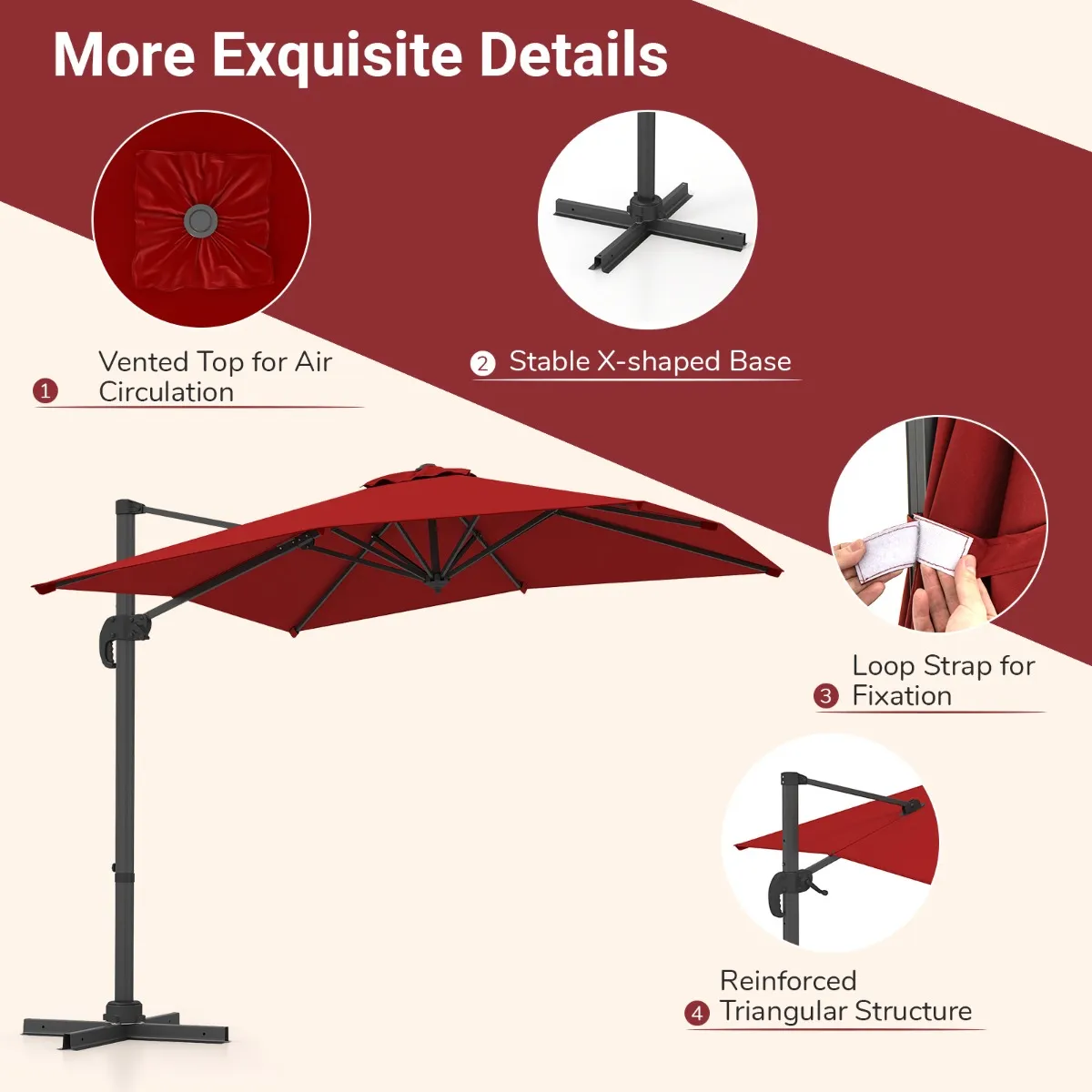 Stevige X-vormige basis: De vierkante terrasparasol wordt geleverd met een robuuste kruisvoet voor extra stabiliteit. We raden aan om een verzwaarde basis (niet inbegrepen) te gebruiken voor extra stevigheid. Perfect geschikt voor zwembaden, tuinen en patio’s.