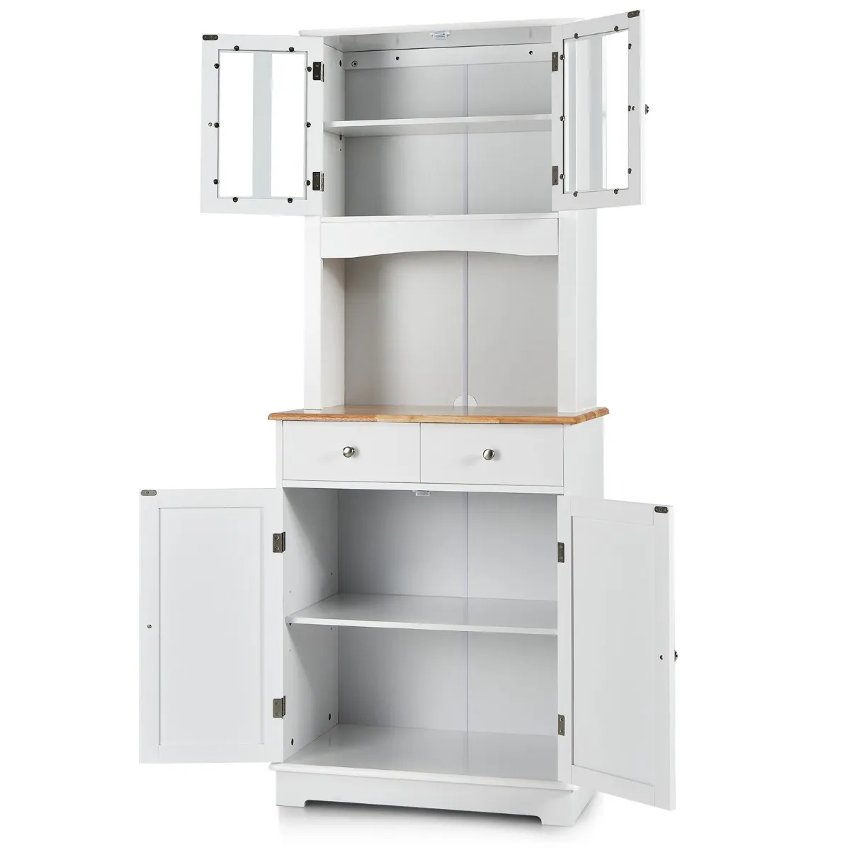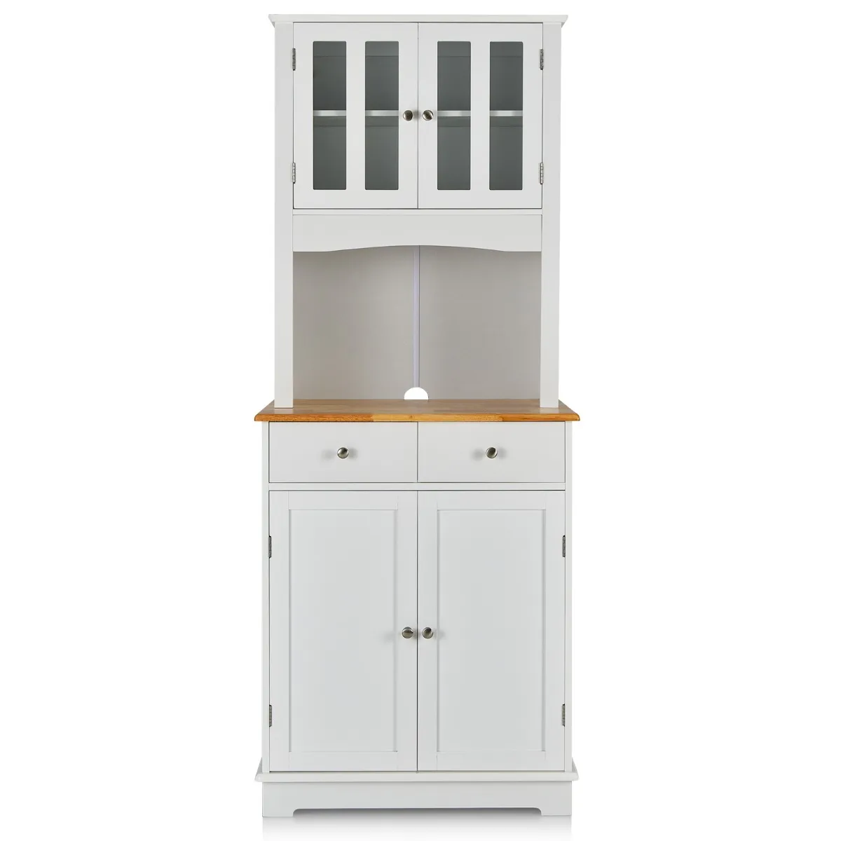 Ons dressoir is gemaakt van hout en gehard glas, dat erg sterk en stabiel is en een lange levensduur belooft. Het geverfde oppervlak is glad en waterdicht, waardoor het gemakkelijk schoon te maken is. Uitgerust met 2 laden en 2 gesloten kasten biedt het veel opbergruimte en de binnenplank kan in 3 hoogtes worden versteld om verschillende spullen op te bergen. Je kunt een magnetron, broodrooster of andere items op de middelste plank plaatsen. Het eenvoudige ontwerp van deze kast past perfect in verschillende interieurstijlen, waardoor hij ideaal is voor de keuken of eetkamer.