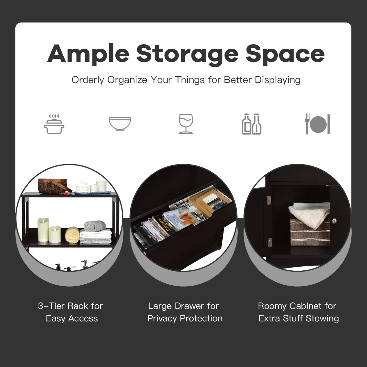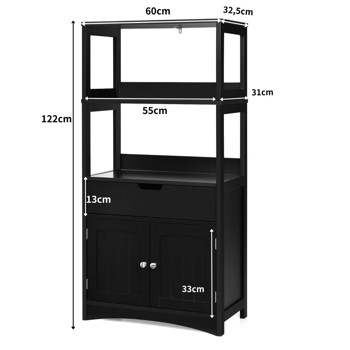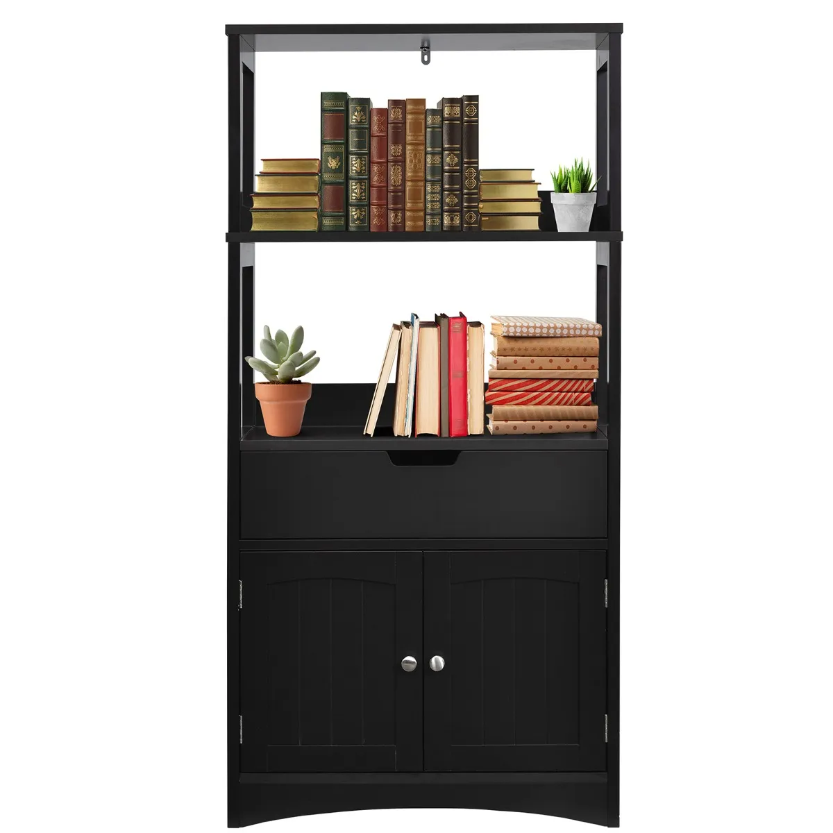 Bent u nog steeds op zoek naar een veelzijdige opbergkast om uw rommelige woning in te richten? Dan is het tijd om de beperkte ruimte ten volle te benutten en u een schoon en comfortabel huis te geven. Perfecte combinatie van milieuvriendelijk houten plaatmateriaal en verf, deze kast is duurzamer en heeft een lange levensduur. De stevige frameconstructie zorgt voor stabiliteit en een groot draagvermogen. Het belangrijkste is dat de anti-kantelinrichting en de ladestopper zijn ontworpen om u dubbele zekerheid te bieden. De lade, de planken en de gesloten kast geven u voldoende opbergruimte om uw spullen beter te kunnen indelen en ordenen. De open schappen van de kast kunnen worden gebruikt om artikelen voor dagelijks gebruik op te bergen. Het eenvoudige uiterlijk en de fijne afwerking zorgen ervoor dat de kast er stijlvol en elegant uitziet. Deze geweldige kast is een ideale keuze voor badkamer, keuken, hal, woonkamer en slaapkamer.