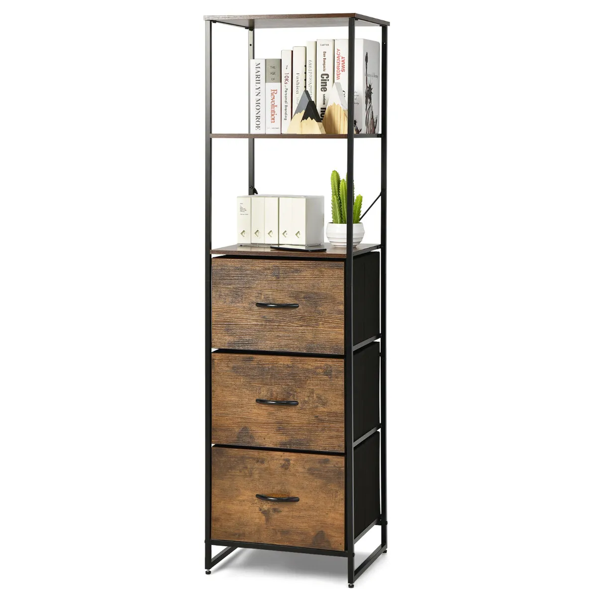 Bent u op zoek naar een decoratief en toch functioneel meubelstuk voor uw huis of kantoor? Dan voldoet deze boekenkast met 6 lagen misschien wel aan uw wensen! De 3 open planken en 3 stoffen lades bieden voldoende ruimte voor uw dagelijkse benodigdheden en houden rommel uit het zicht terwijl u uw geliefde verzamelingen of ornamenten tentoonstelt. Bovendien, met een industriële uitstraling, is de opslageenheid ideaal voor verschillende kamers, zoals slaapkamer, woonkamer of studeerkamer. Overigens is de hoge boekenkast, ondersteund door een stalen frame, stabiel en duurzaam, vooral met de X dwarsbalken. Bovendien dragen de verstelbare voetsteunen en de anti-kantelbeveiliging bij aan de algehele stabiliteit.