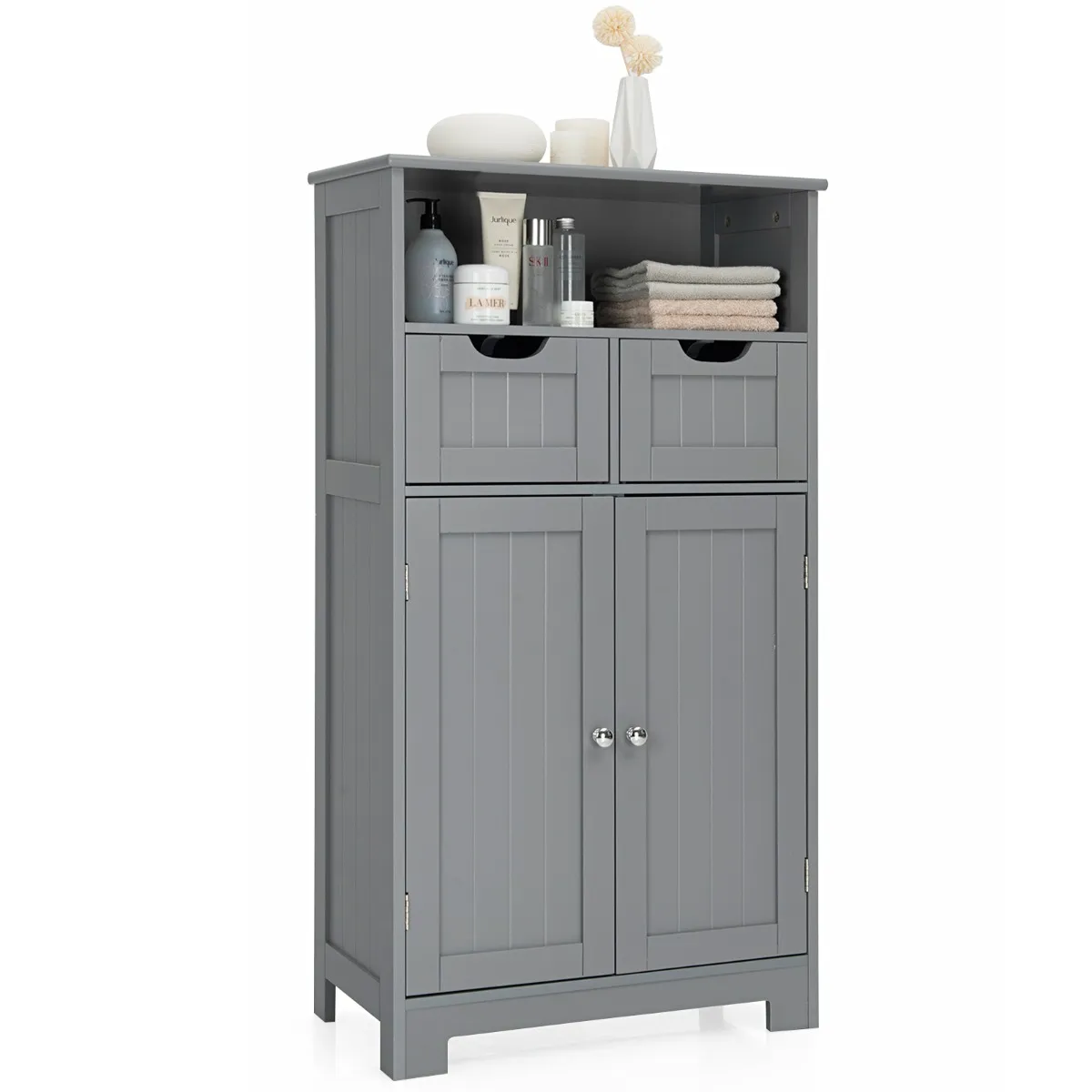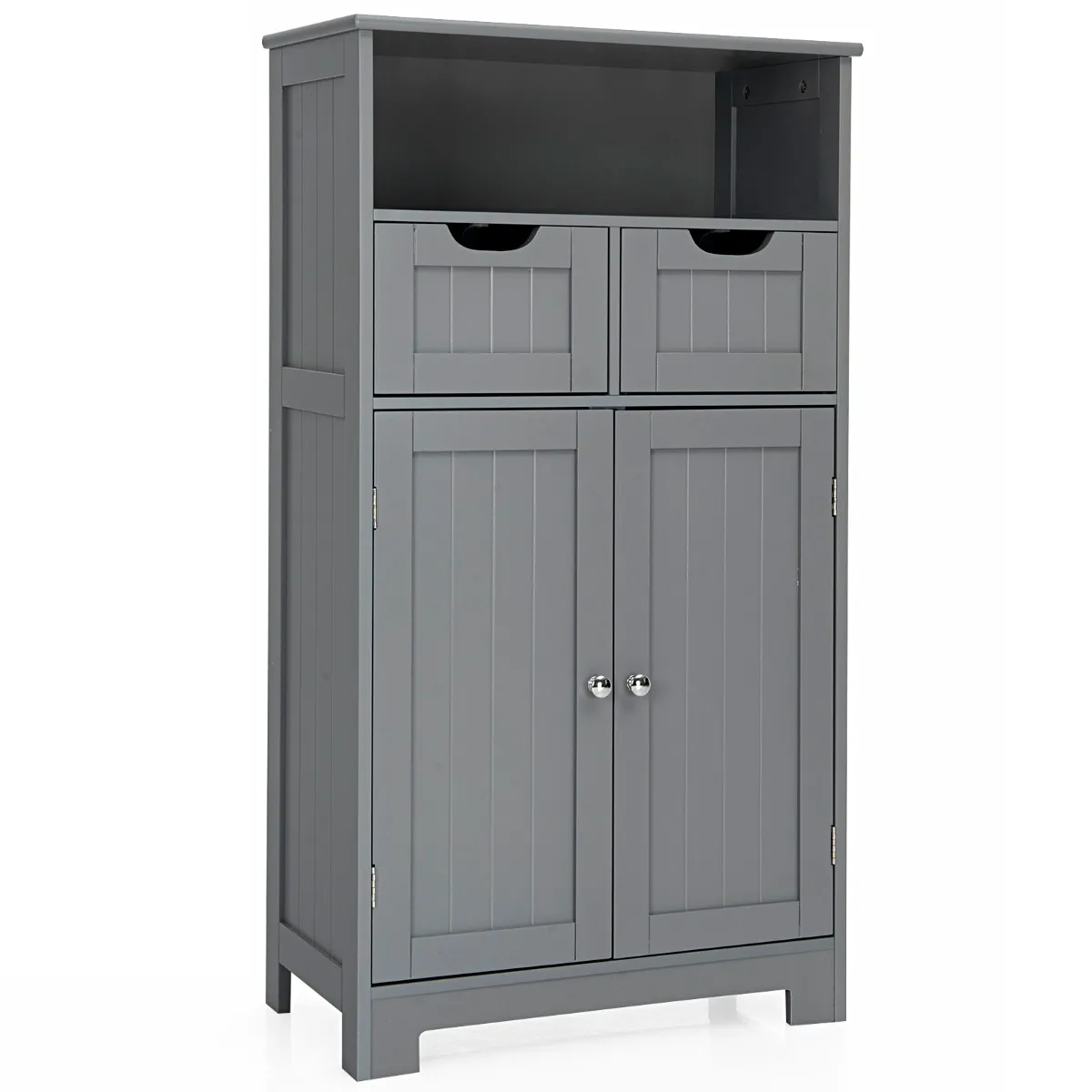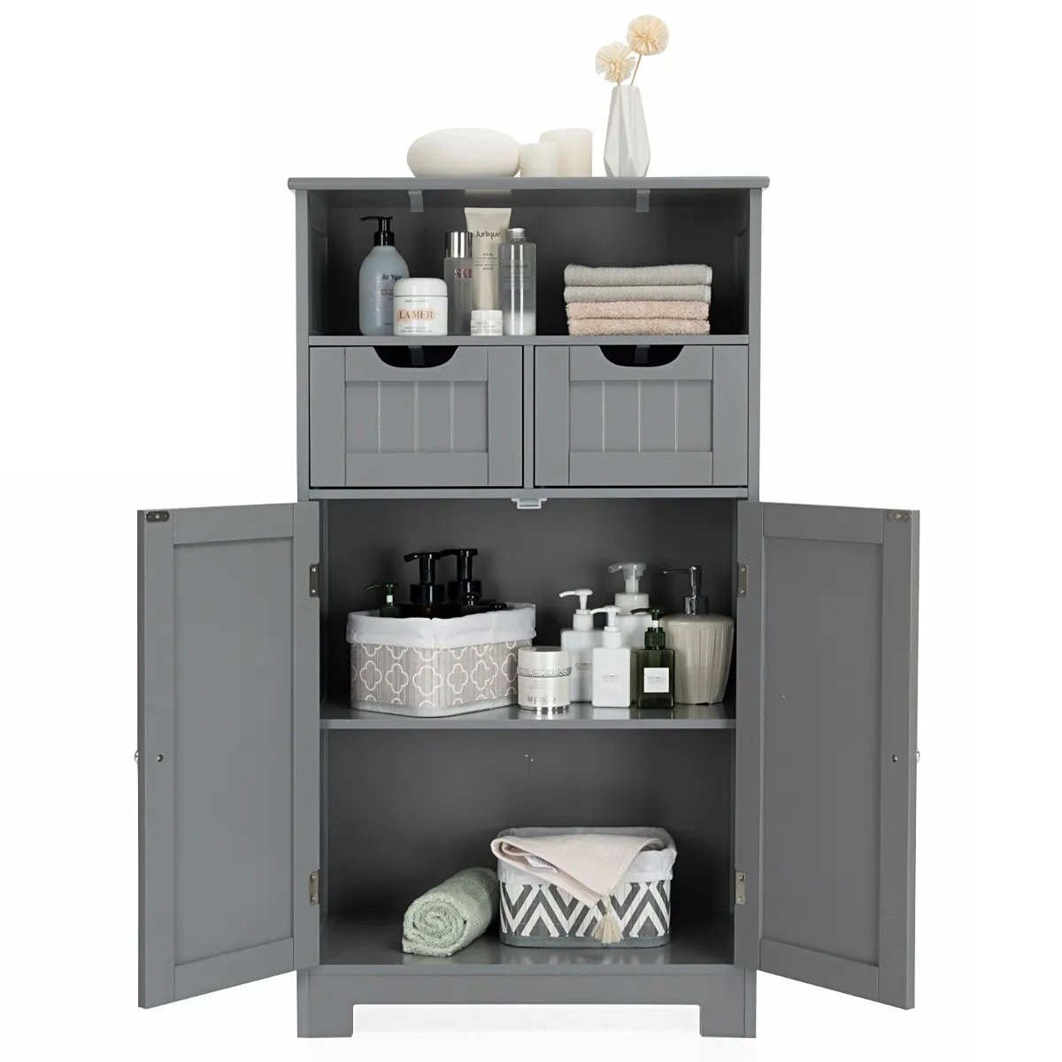 Deze kast van vloer tot plafond is de perfecte manier om veel ruimte in uw huis te besparen! De verdeling in drie verschillende niveaus is ideaal voor het sorteren en ordelijk opbergen van uw spullen. De open schapruimte biedt hier een ideale plaats voor uw dagelijkse voorwerpen, zodat u er snel en gemakkelijk bij kunt. U kunt de twee laden op het middelste of bovenste niveau plaatsen, afhankelijk van uw voorkeur, en het onderste niveau is verdeeld in twee legplanken waarvan u de verdeelplank extra kunt aanpassen of verwijderen. De vervaardiging uit hoogwaardige MDF-panelen geeft deze kast een hoge mate van stabiliteit en robuustheid, zodat u hem lang kunt gebruiken. Dankzij de lakafwerking is het oppervlak van de kast zowel waterbestendig als krasbestendig. De deuren van de onderkast sluiten ook volledig dicht dankzij een magneet, zodat er niets uit kan vallen, en kunnen comfortabel worden geopend en gesloten met behulp van de ronde deurgrepen. U kunt deze veelzijdige kast niet alleen in uw badkamer gebruiken, maar ook in uw slaapkamer, woonkamer en keuken als vrijstaande organizer. Dankzij het stijlvolle uiterlijk past deze kast perfect in elk bestaand interieur.